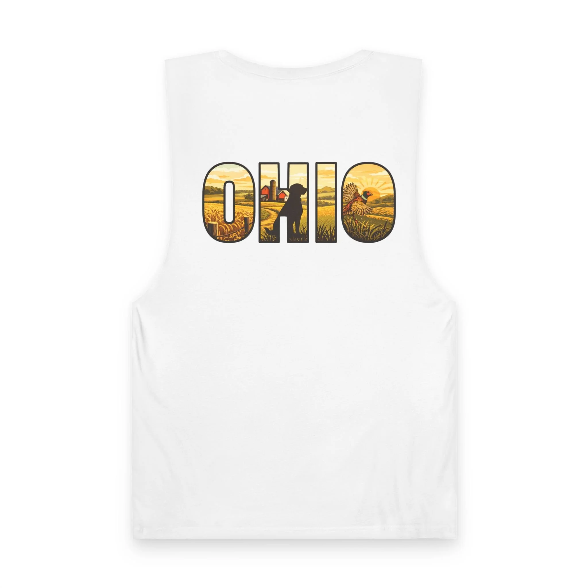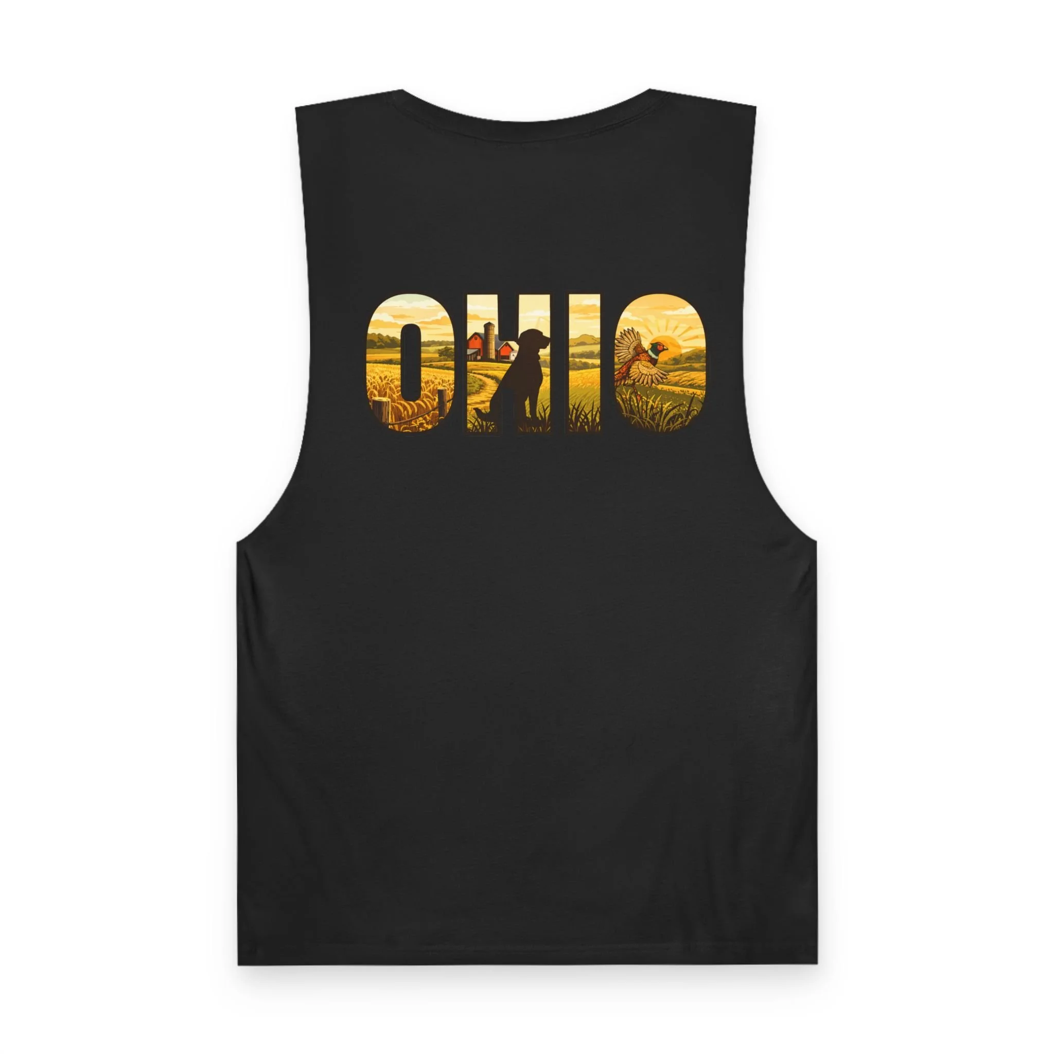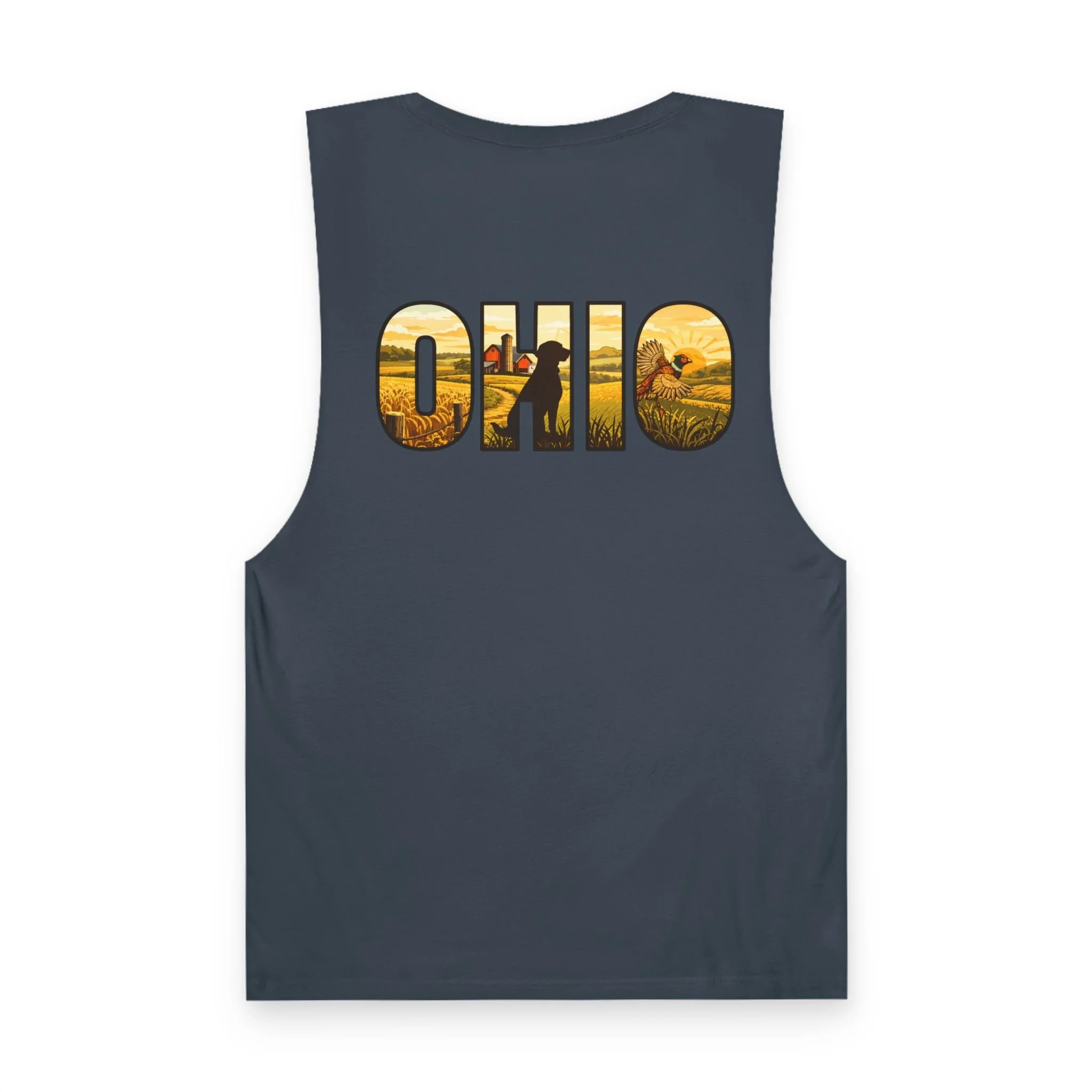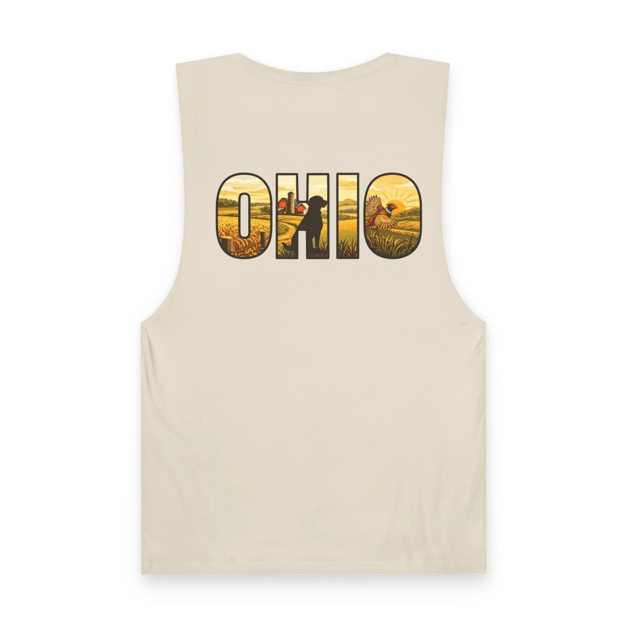Lightweight and lived-in, this tank brings a warm, midwestern summer to your everyday rotation. A small flying quail on the chest pocket gives a quiet nod to field days and morning hunts. On the back, bold “OHIO” lettering is filled with golden harvest fields and a lone hunter walking the rows — a scene that reads like the end of a perfect dusk. Thin, breathable cotton and raw armhole edges give the shirt an easy, broken-in look that works whether you’re walking the river trail, leaning on a pickup bed, or sitting around a campfire swapping stories.