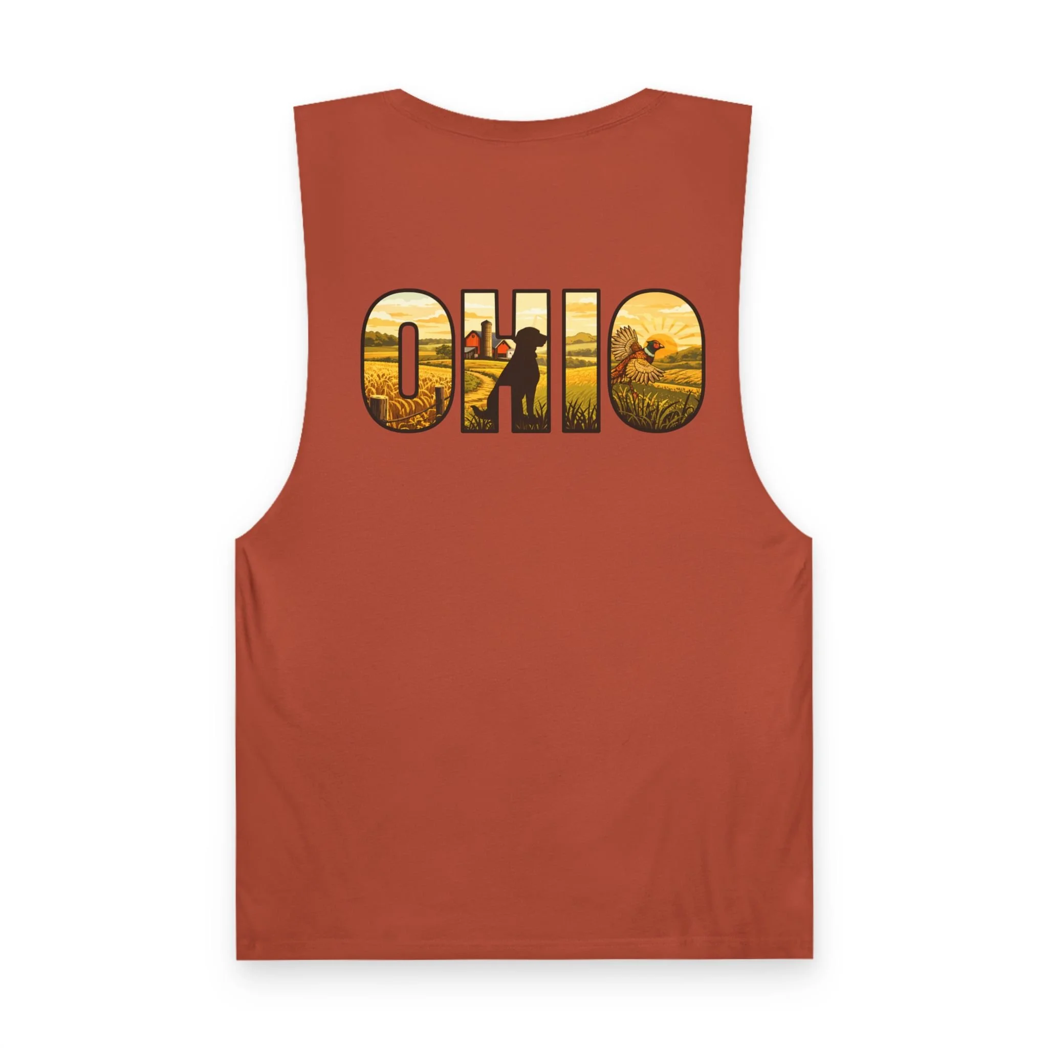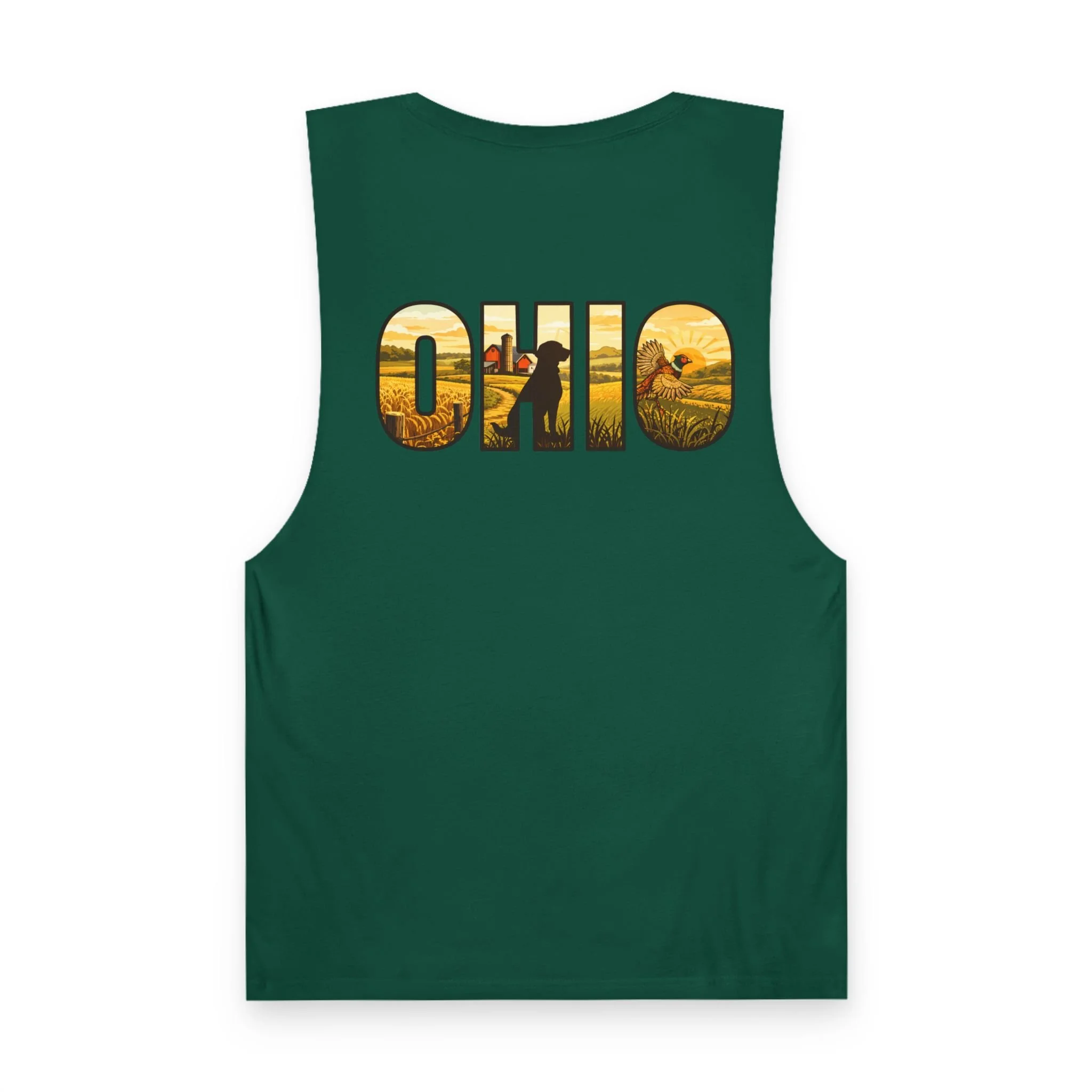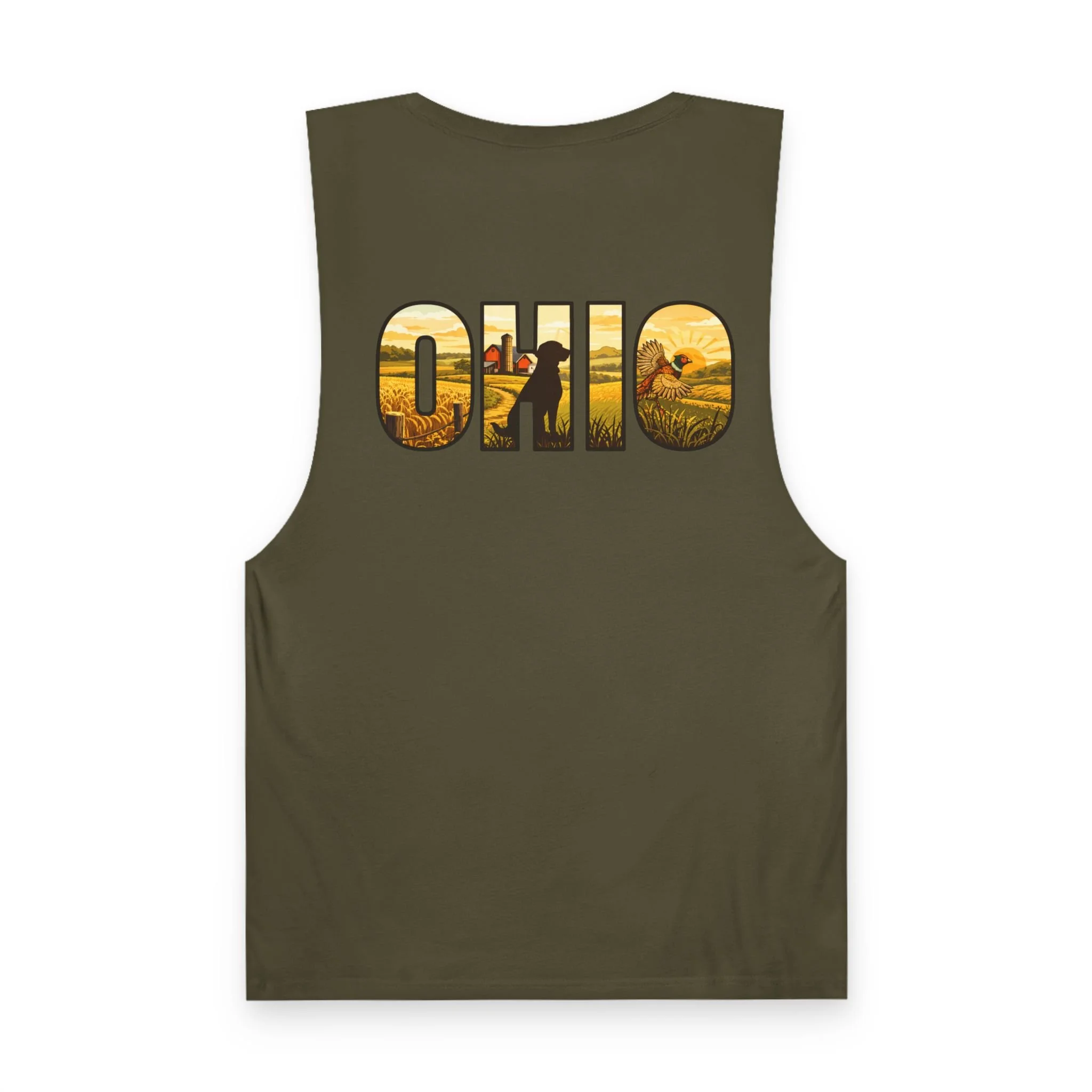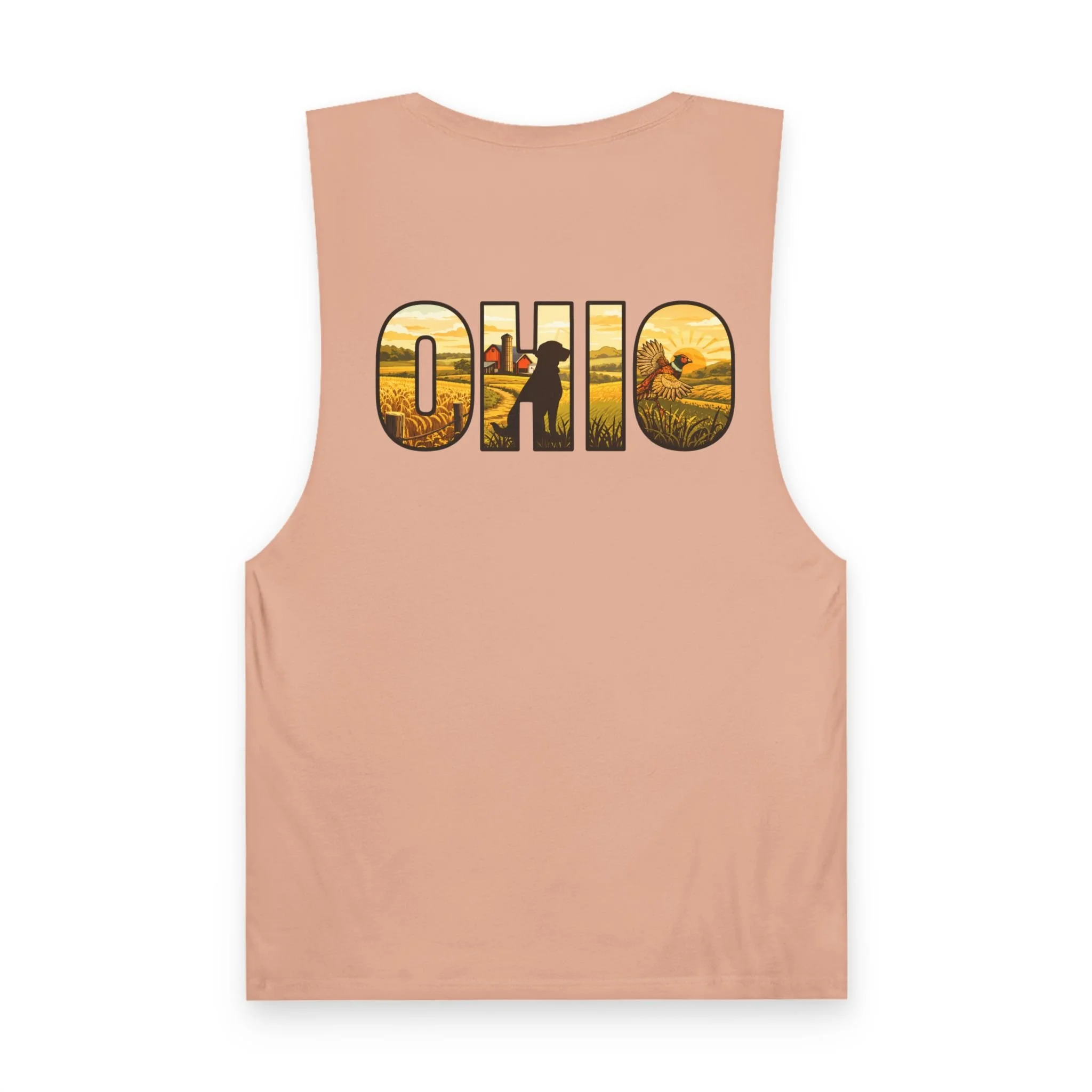Lightweight and lived-in, this tank brings a warm, midwestern summer to your everyday rotation. A small flying quail on the chest pocket gives a quiet nod to field days and morning hunts. On the back, bold “OHIO” lettering is filled with golden harvest fields and a lone hunter walking the rows — a scene that reads like the end of a perfect dusk. Thin, breathable cotton and raw armhole edges give the shirt an easy, broken-in look that works whether you’re walking the river trail, leaning on a pickup bed, or sitting around a campfire swapping stories.
