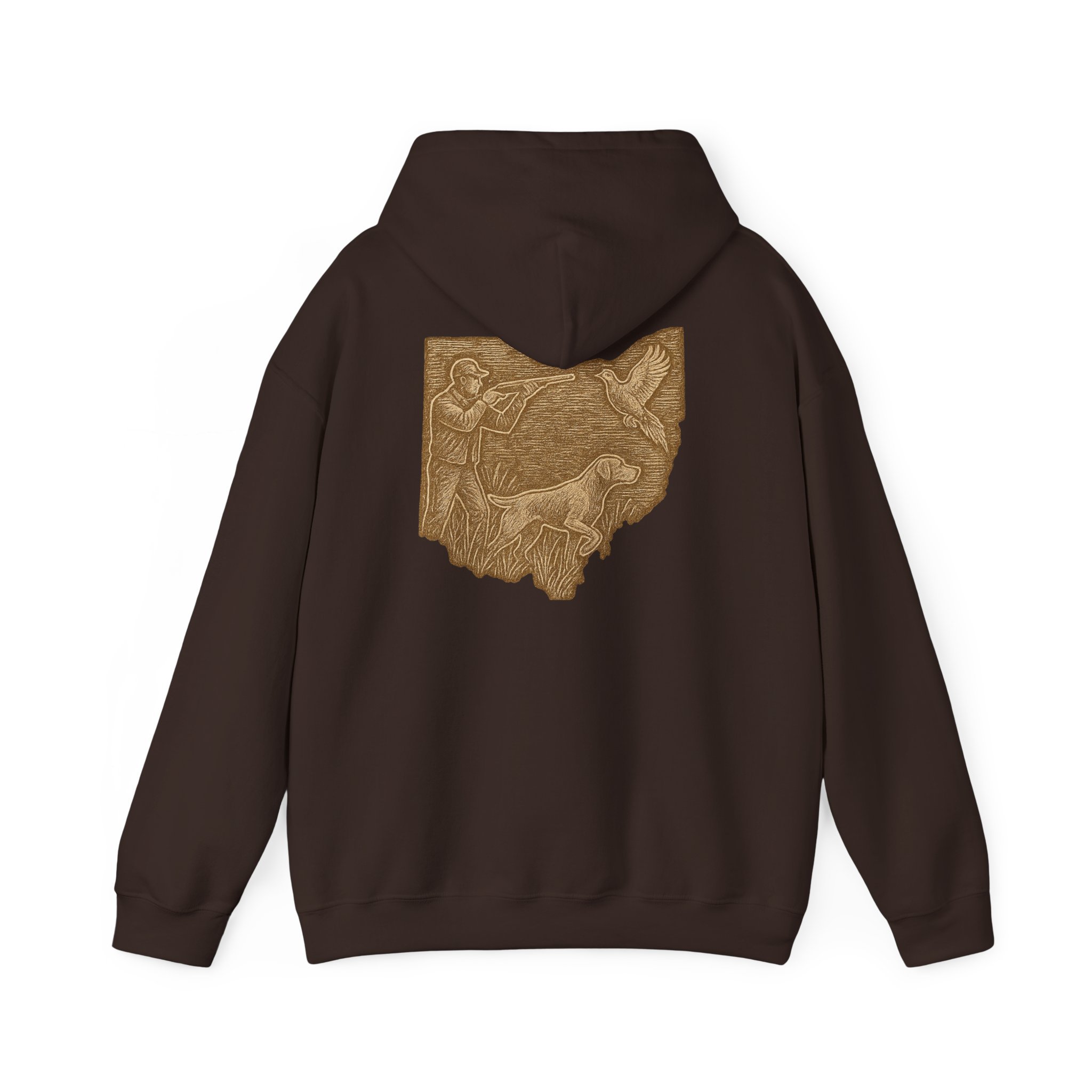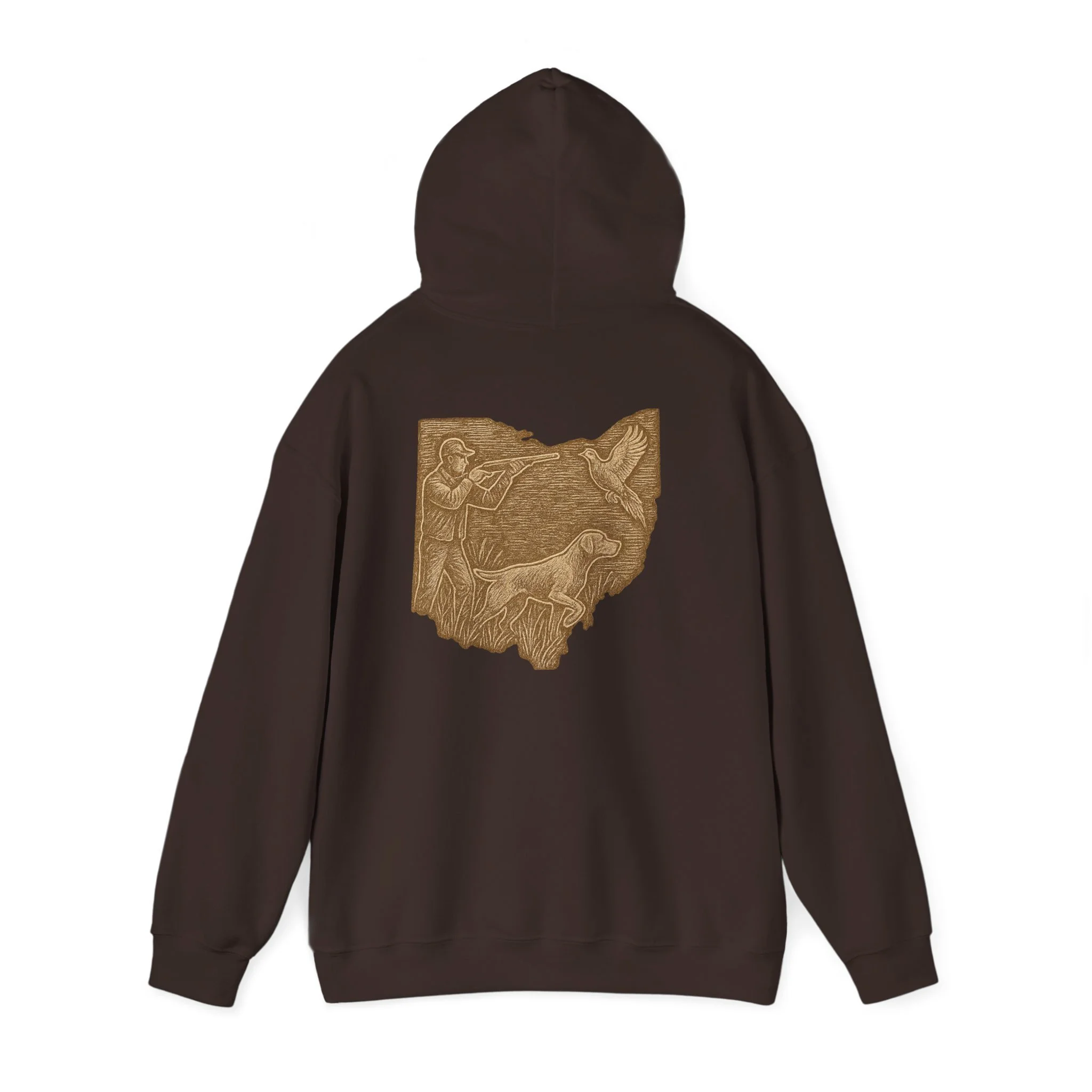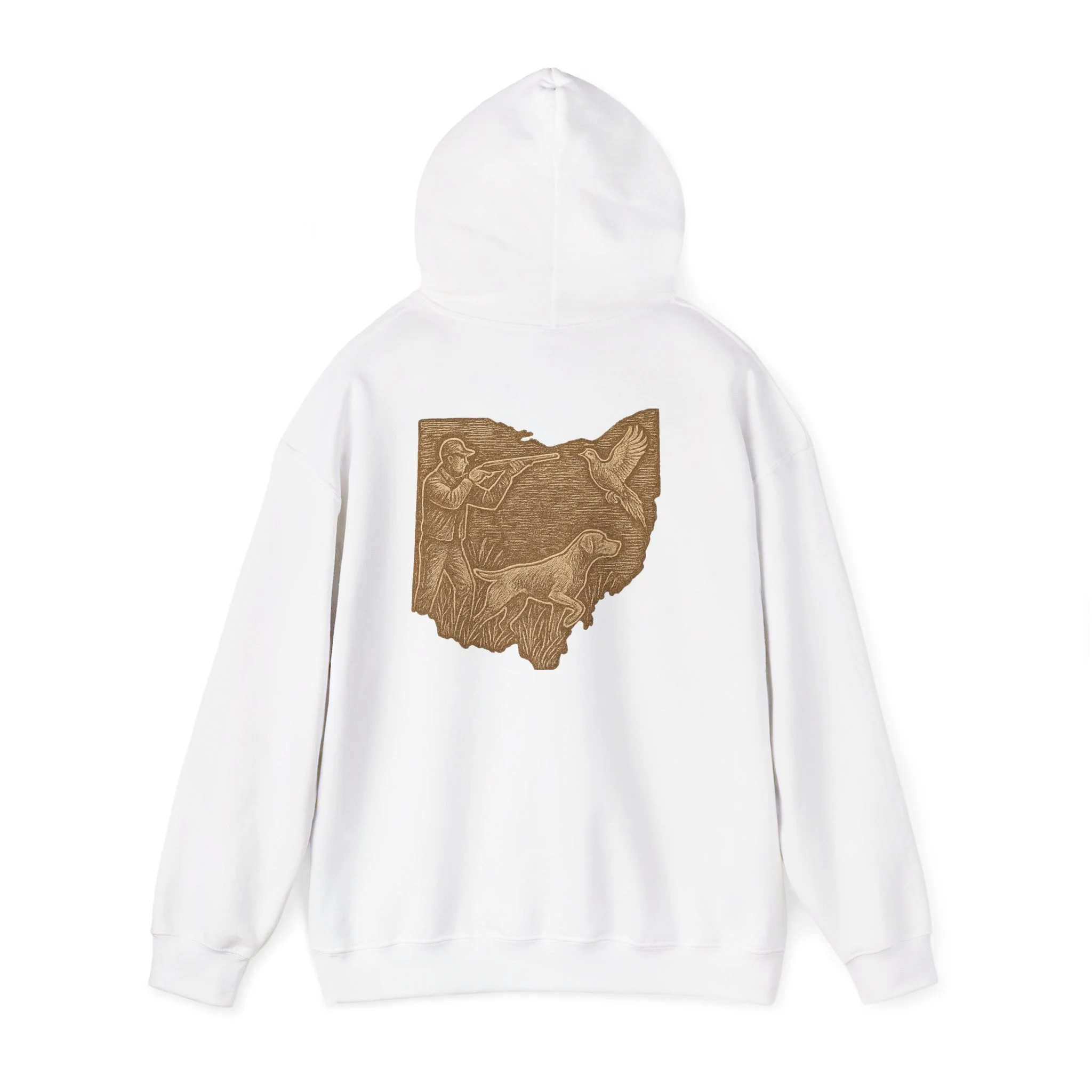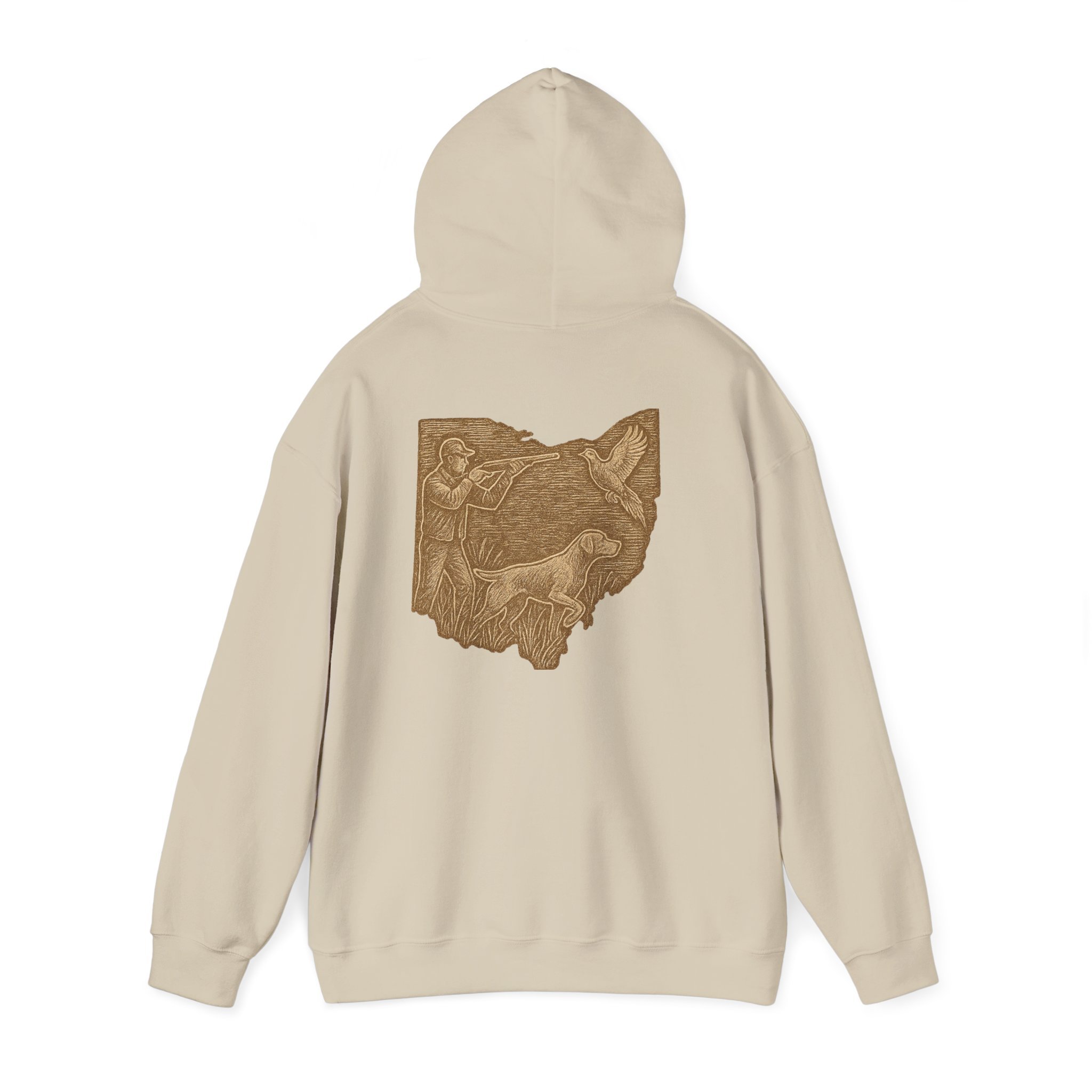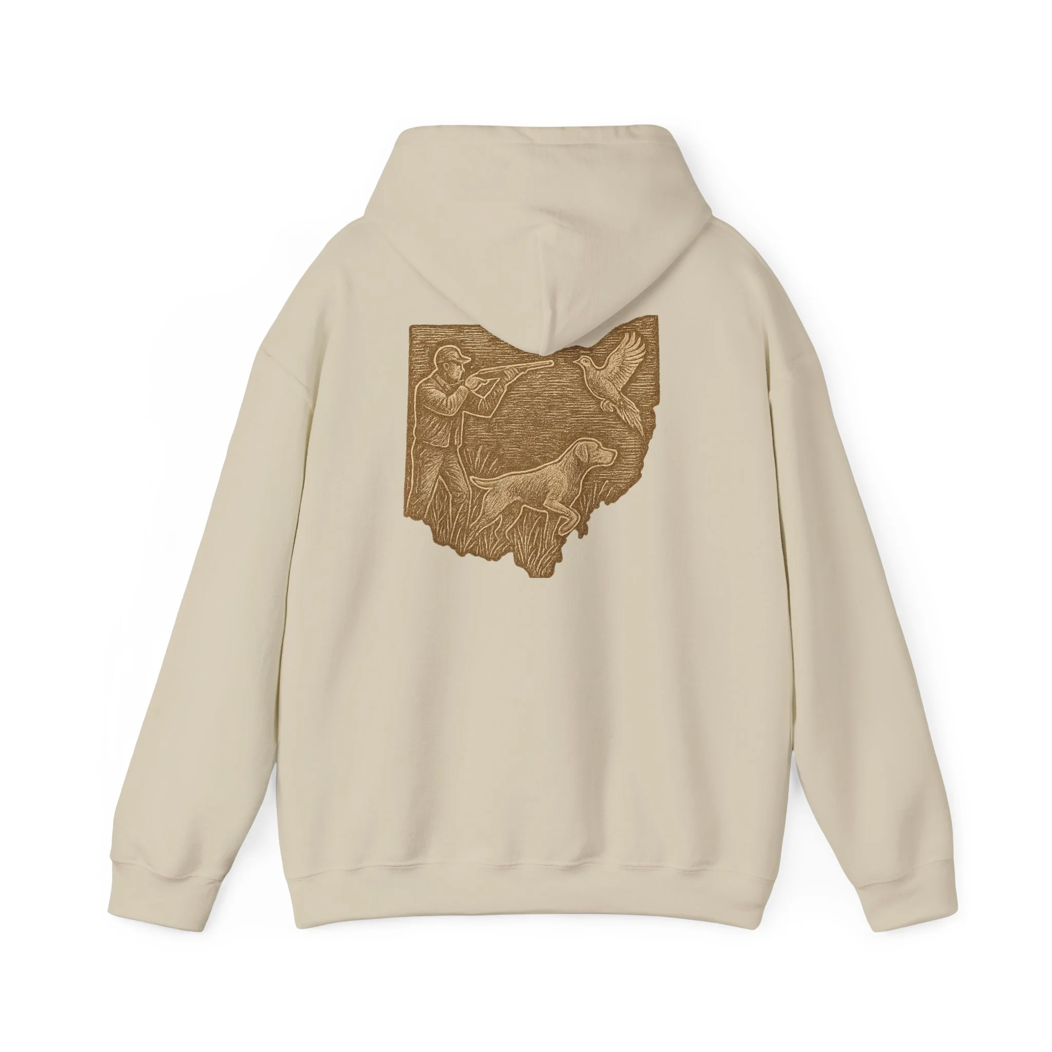 This cozy hoodie carries a quiet, handcrafted vibe — soft, warm, and ready to become the one you reach for on slow mornings or long drives. The design on the back is etched in warm, sepia tones that feel like a pressed memory: a detailed scene printed in a single-color palette that sits inside the silhouette of Ohio. It reads like a personal emblem — familiar, grounded, and slightly nostalgic. The roomy kangaroo pocket and double-lined hood invite you to linger outside with a coffee or curl up on the couch with a book. Durable fabric and careful construction mean the print sits beautifully on the surface, while embroidery and DTF print options let you dial in extra texture and detail if you want a more tactile finish. Wear it to hometown gatherings, low-key meetups, or while exploring local trails — it fits seamlessly into quiet routines and the small rituals of everyday life.