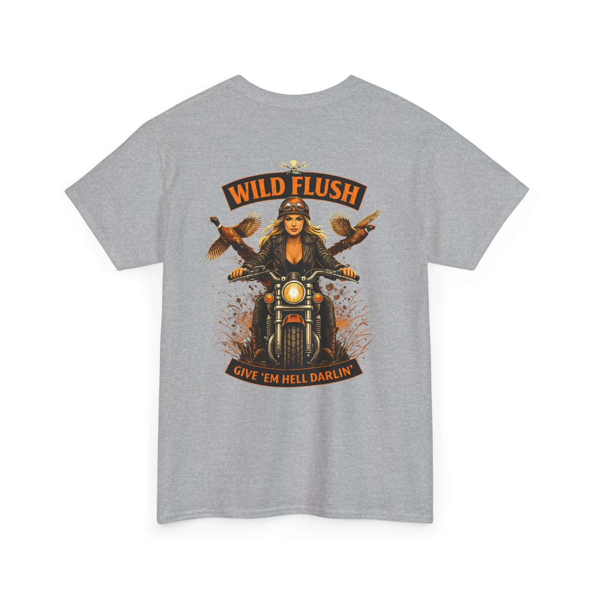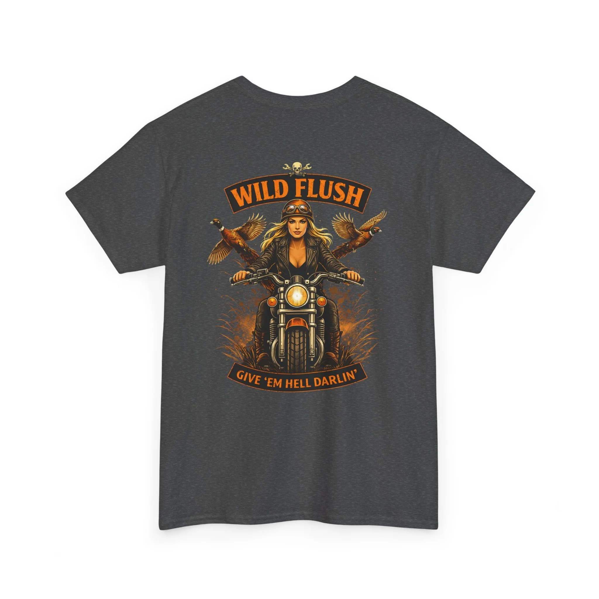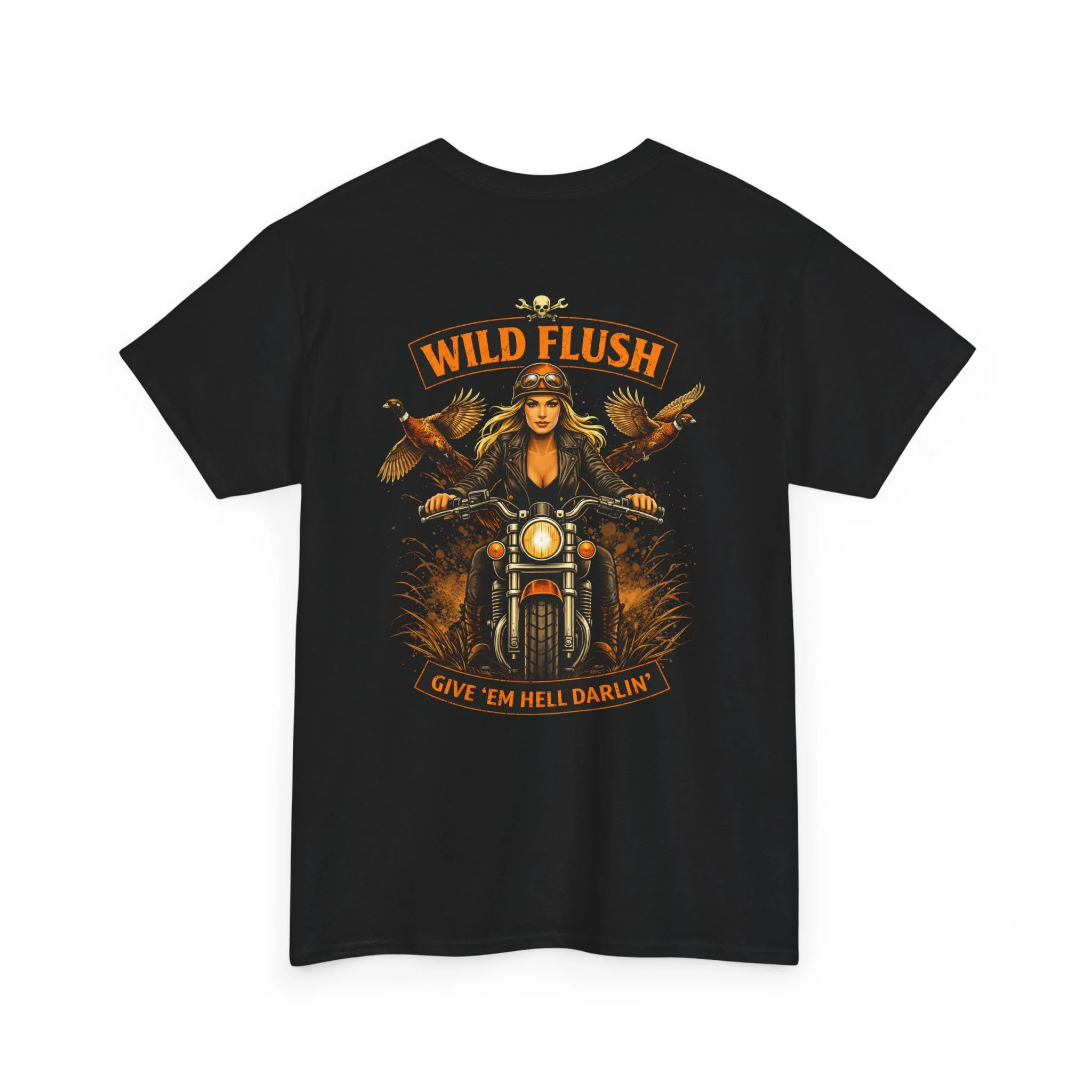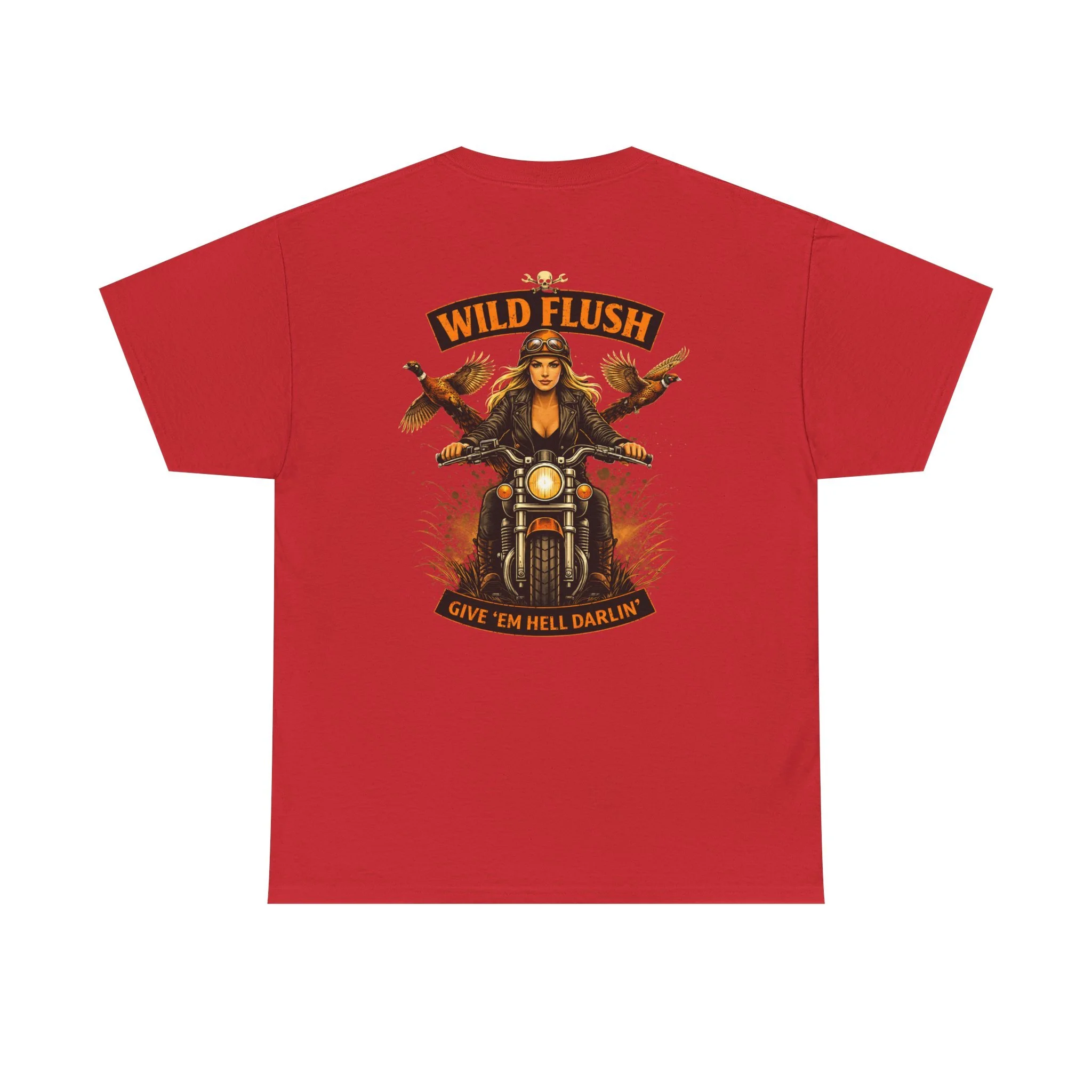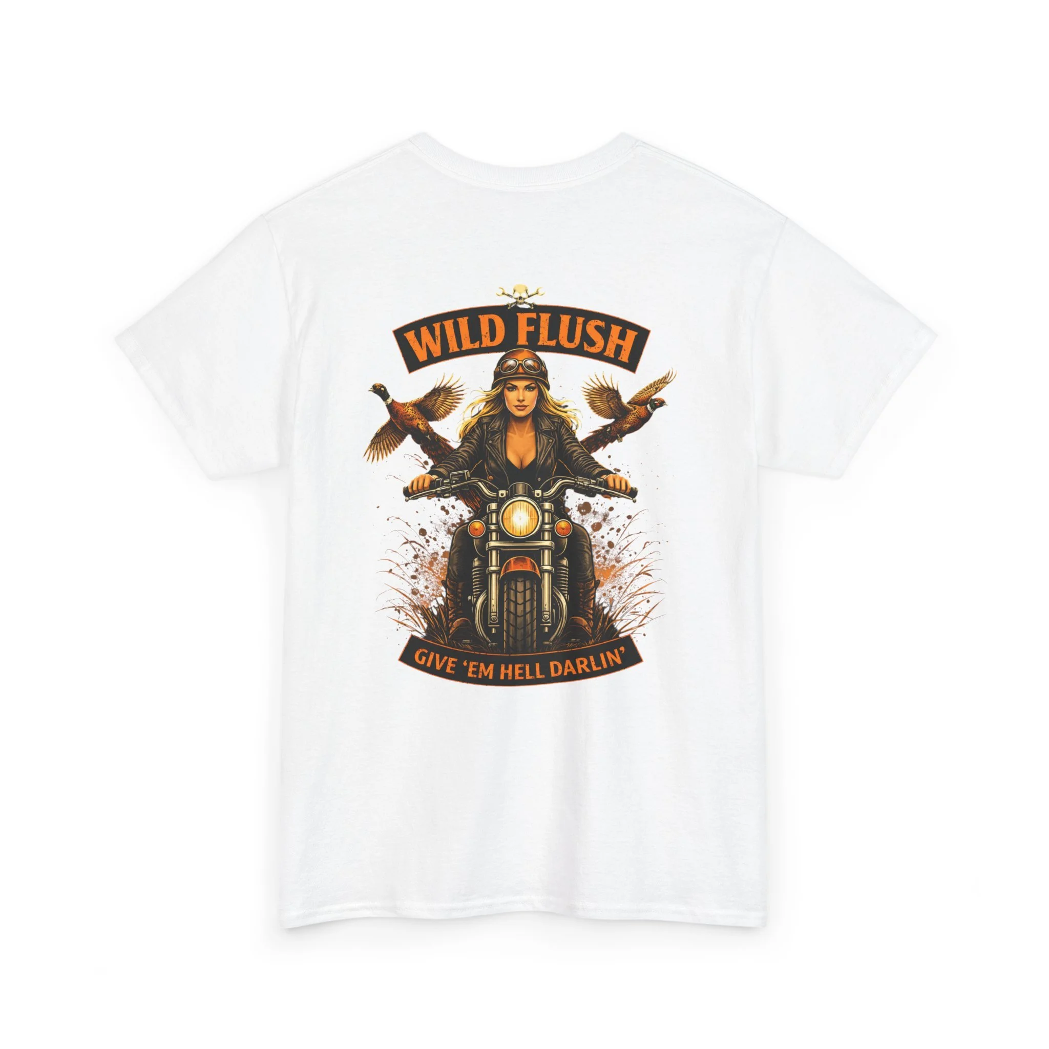 This heavyweight cotton tee carries a bold, road-ready spirit. A compact chest emblem keeps things subtle up front while a striking, vintage-inspired biker illustration dominates the back — a woman rider framed by two birds and the banner reading “WILD FLUSH.” The print uses vivid DTF and DTG techniques for crisp details and saturated color that pop against the natural white fabric. The shirt’s classic relaxed fit, ribbed collar, and tubular knit construction make it an easy layer for long rides, weekend hangs, or casual nights out. It feels lived-in from the first wear but built to last: ethically sourced cotton, reinforced shoulder tape, and a tear-away label for itch-free comfort. This piece settles into a wardrobe the way an old favorite should — with attitude, durability, and a story to wear.