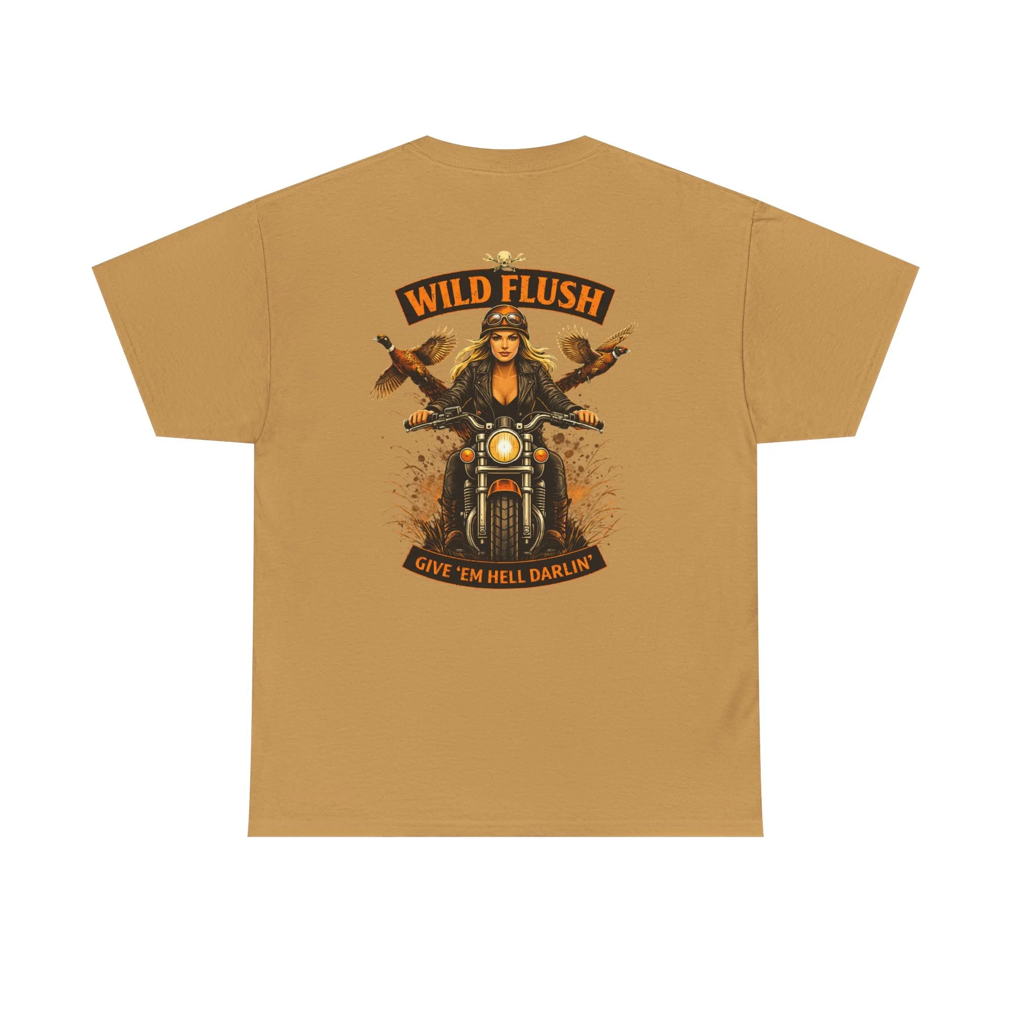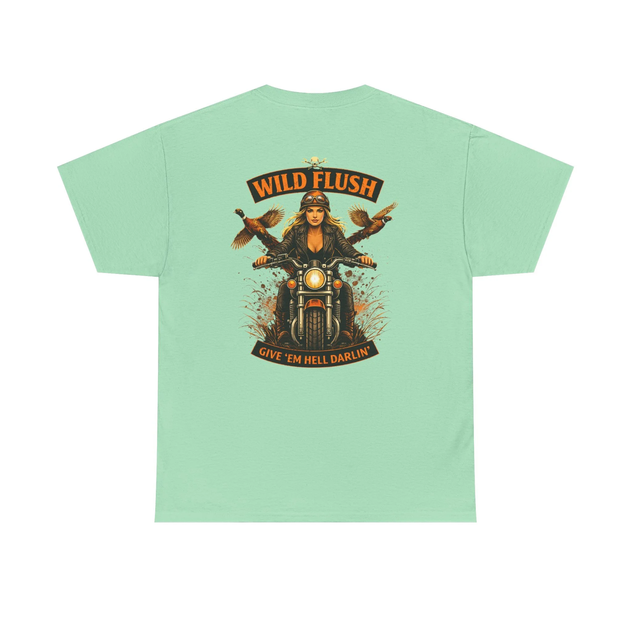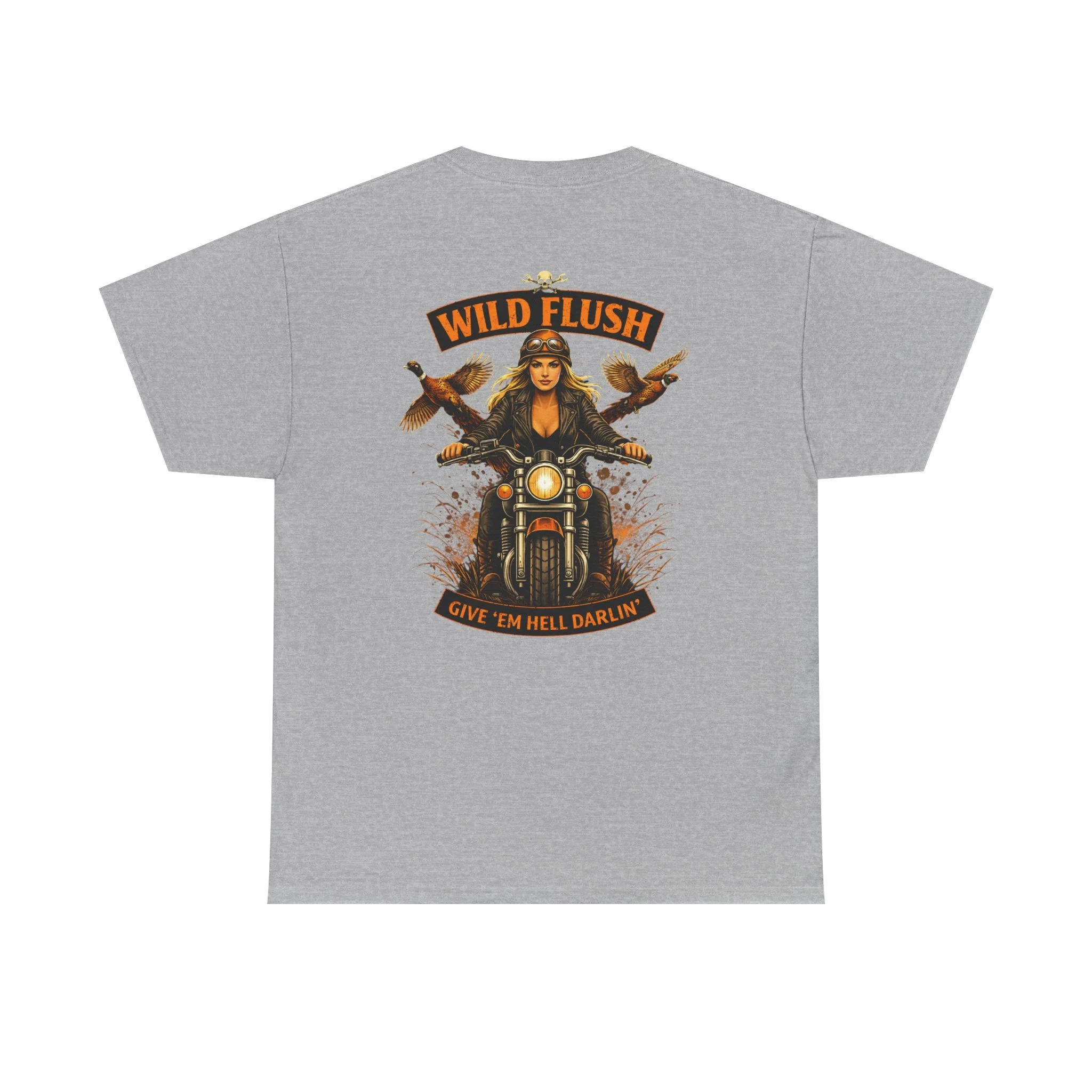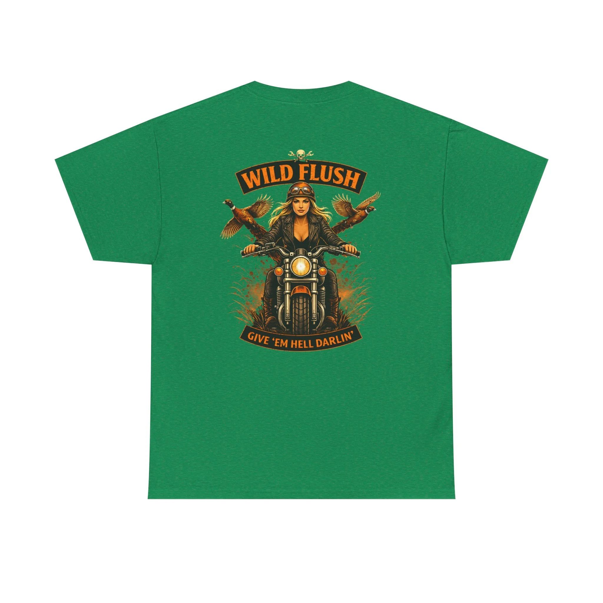 This heavyweight cotton tee carries a bold, road-ready spirit. A compact chest emblem keeps things subtle up front while a striking, vintage-inspired biker illustration dominates the back — a woman rider framed by two birds and the banner reading “WILD FLUSH.” The print uses vivid DTF and DTG techniques for crisp details and saturated color that pop against the natural white fabric. The shirt’s classic relaxed fit, ribbed collar, and tubular knit construction make it an easy layer for long rides, weekend hangs, or casual nights out. It feels lived-in from the first wear but built to last: ethically sourced cotton, reinforced shoulder tape, and a tear-away label for itch-free comfort. This piece settles into a wardrobe the way an old favorite should — with attitude, durability, and a story to wear.