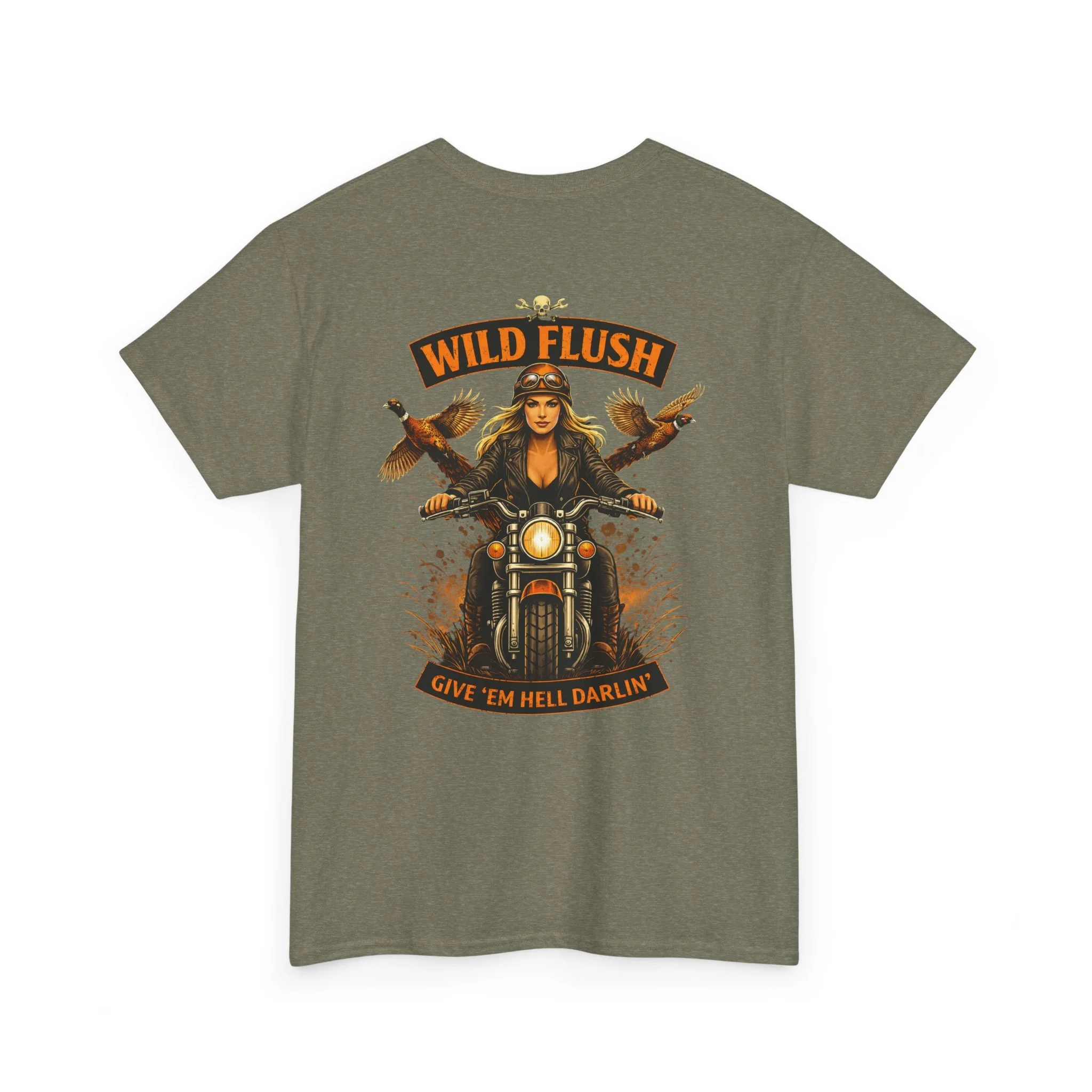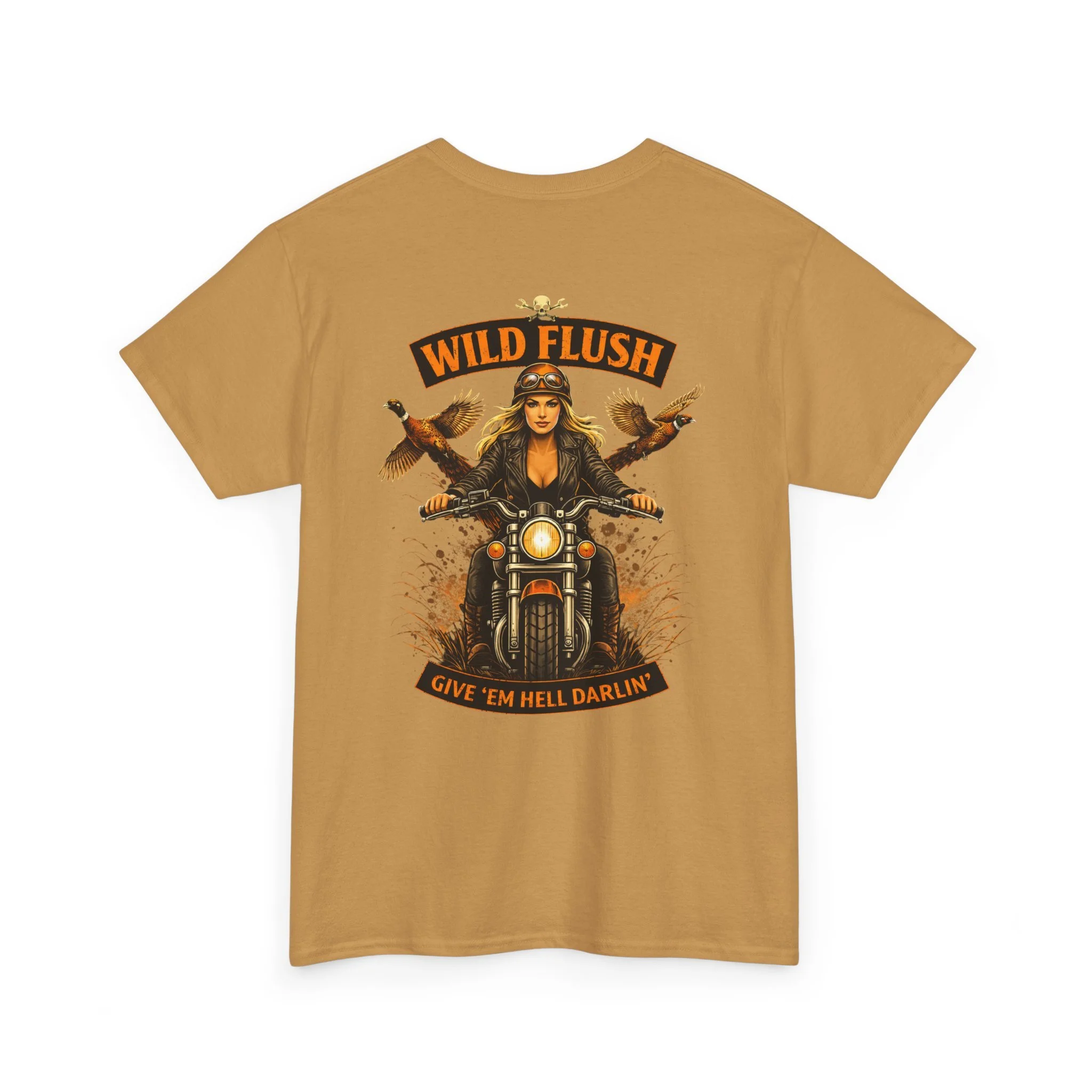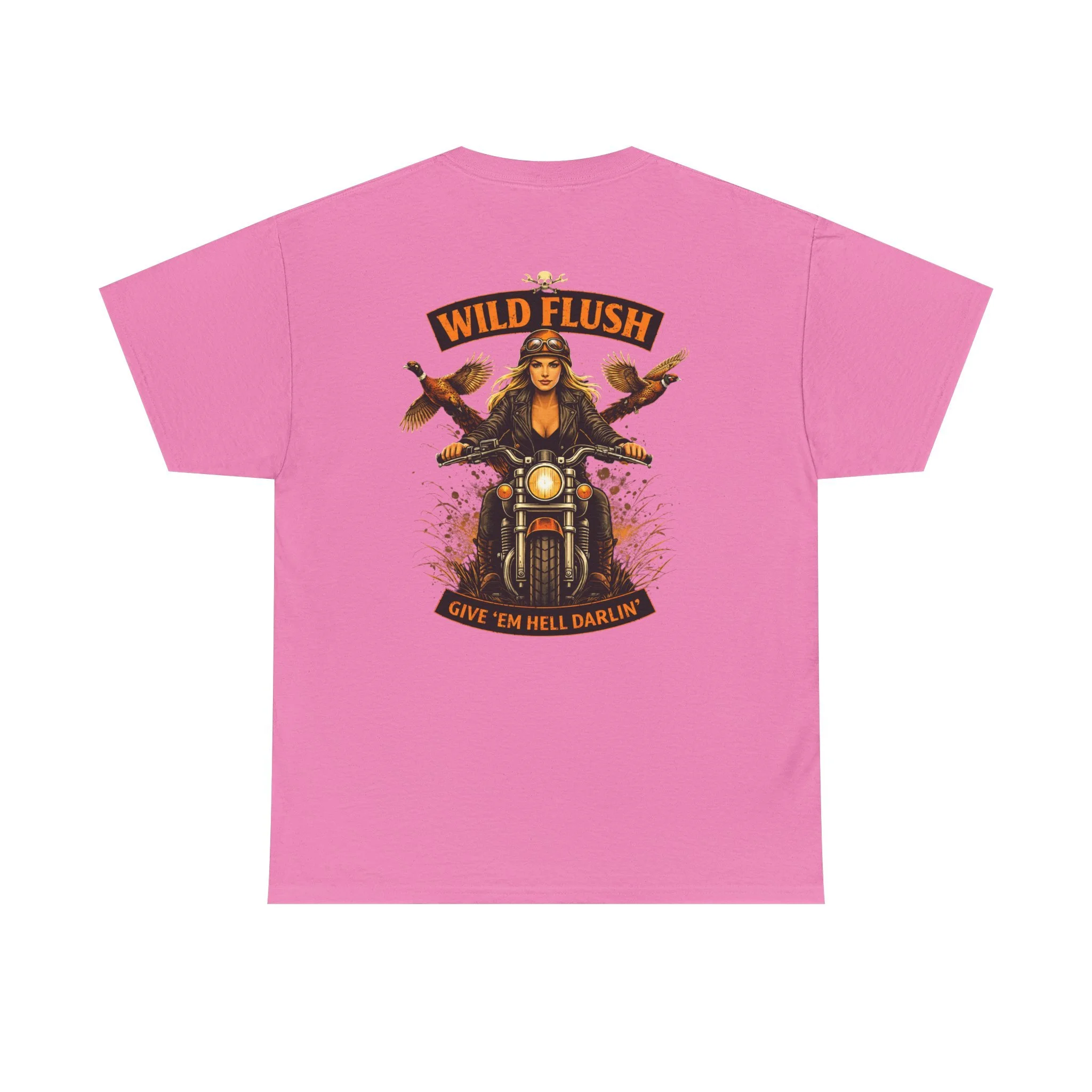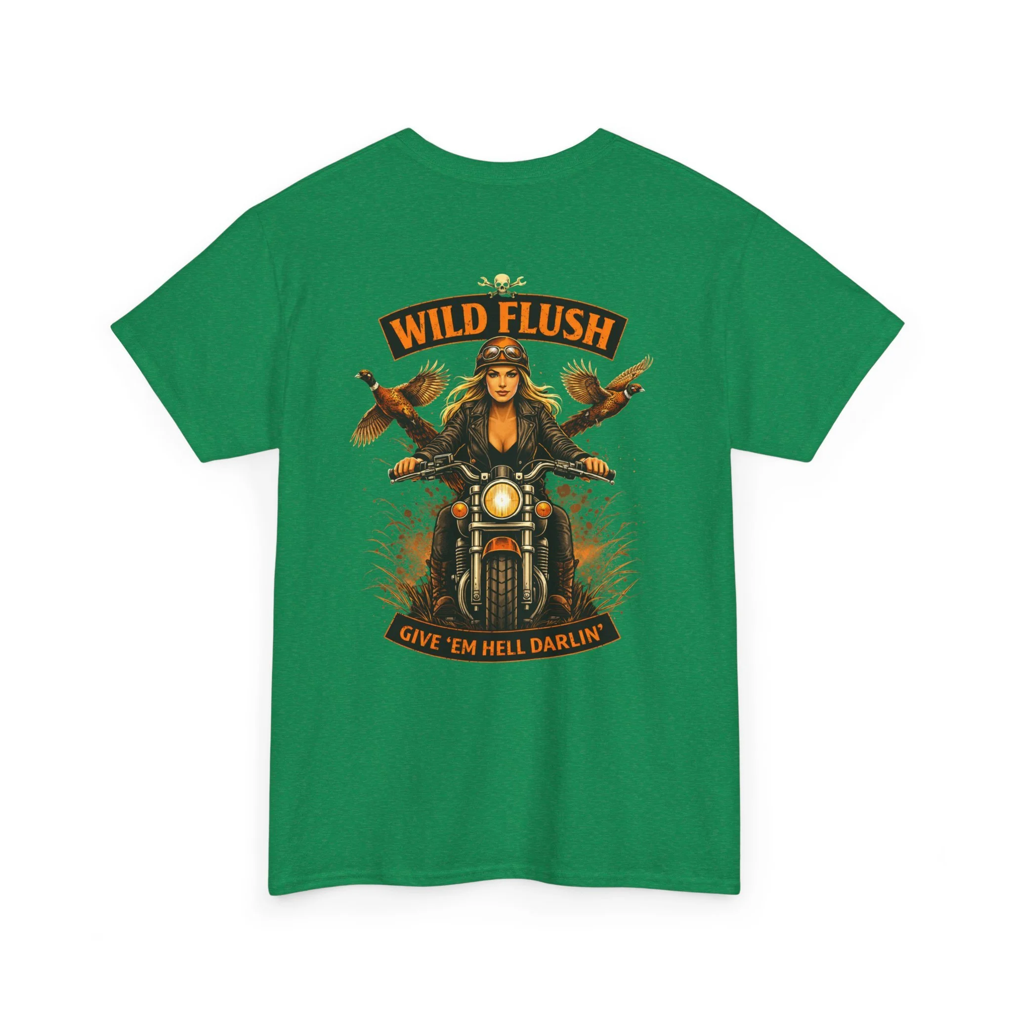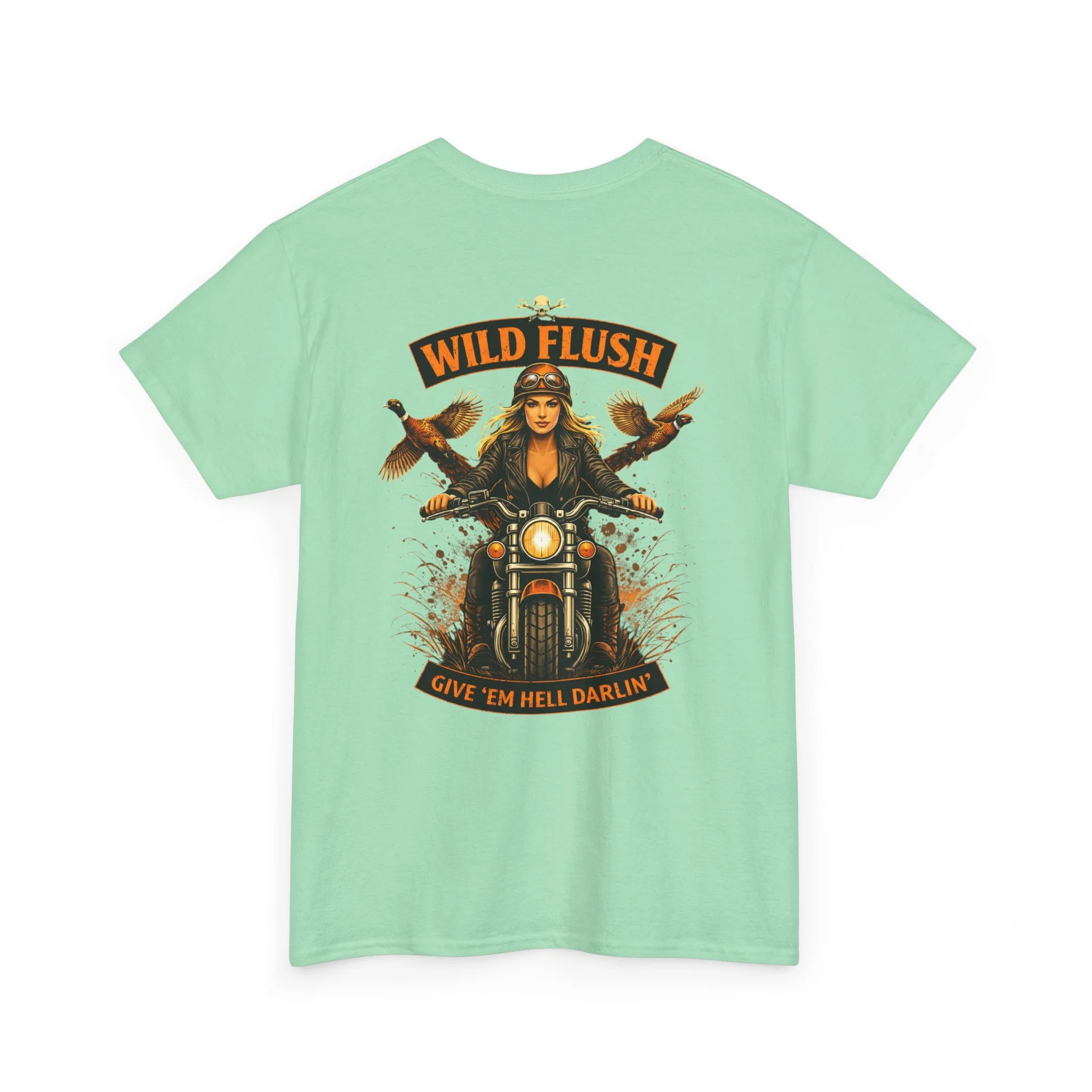 This heavyweight cotton tee carries a bold, road-ready spirit. A compact chest emblem keeps things subtle up front while a striking, vintage-inspired biker illustration dominates the back — a woman rider framed by two birds and the banner reading “WILD FLUSH.” The print uses vivid DTF and DTG techniques for crisp details and saturated color that pop against the natural white fabric. The shirt’s classic relaxed fit, ribbed collar, and tubular knit construction make it an easy layer for long rides, weekend hangs, or casual nights out. It feels lived-in from the first wear but built to last: ethically sourced cotton, reinforced shoulder tape, and a tear-away label for itch-free comfort. This piece settles into a wardrobe the way an old favorite should — with attitude, durability, and a story to wear.