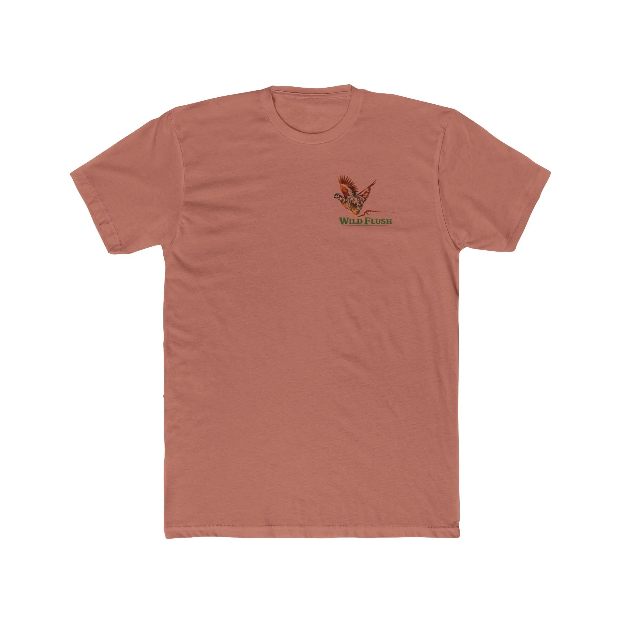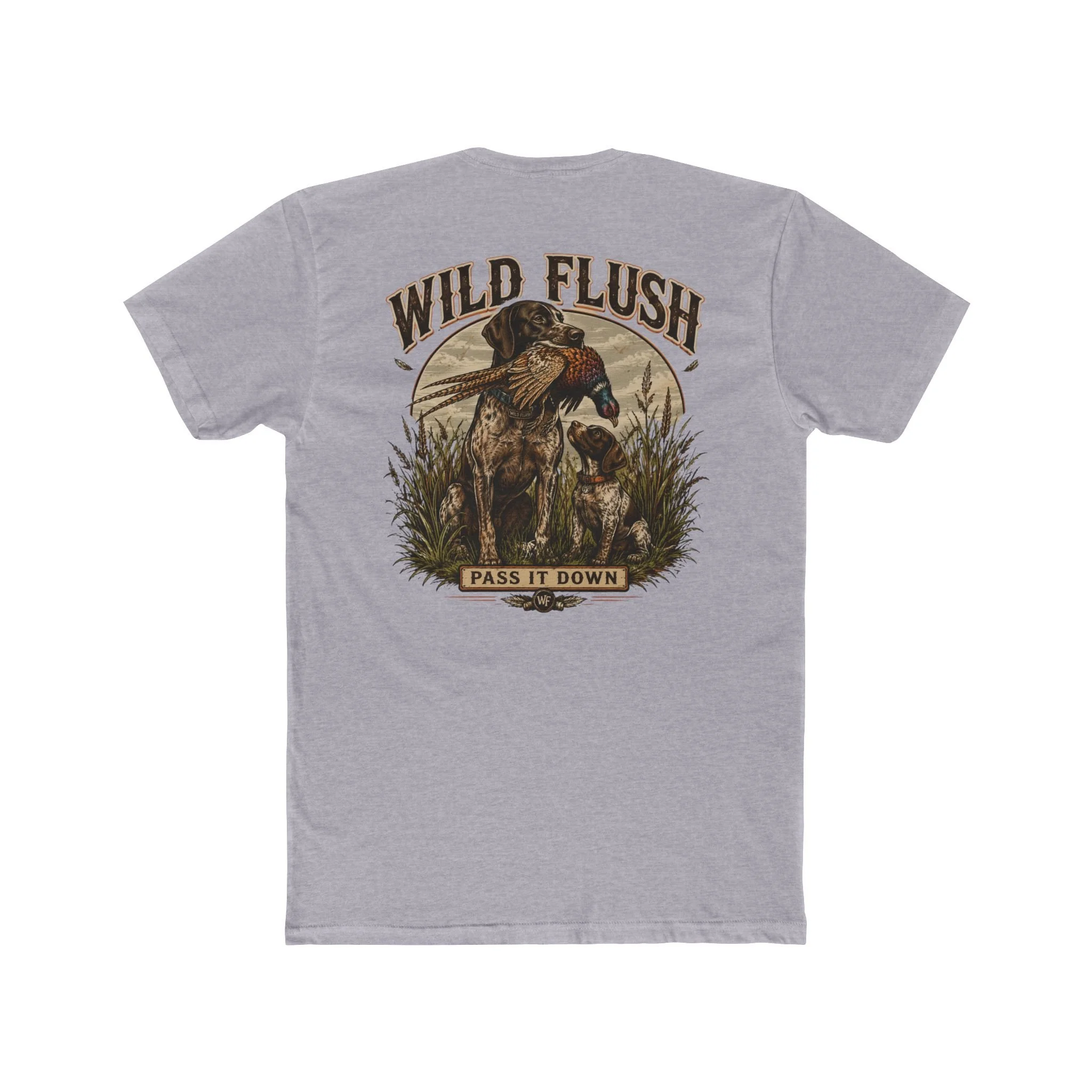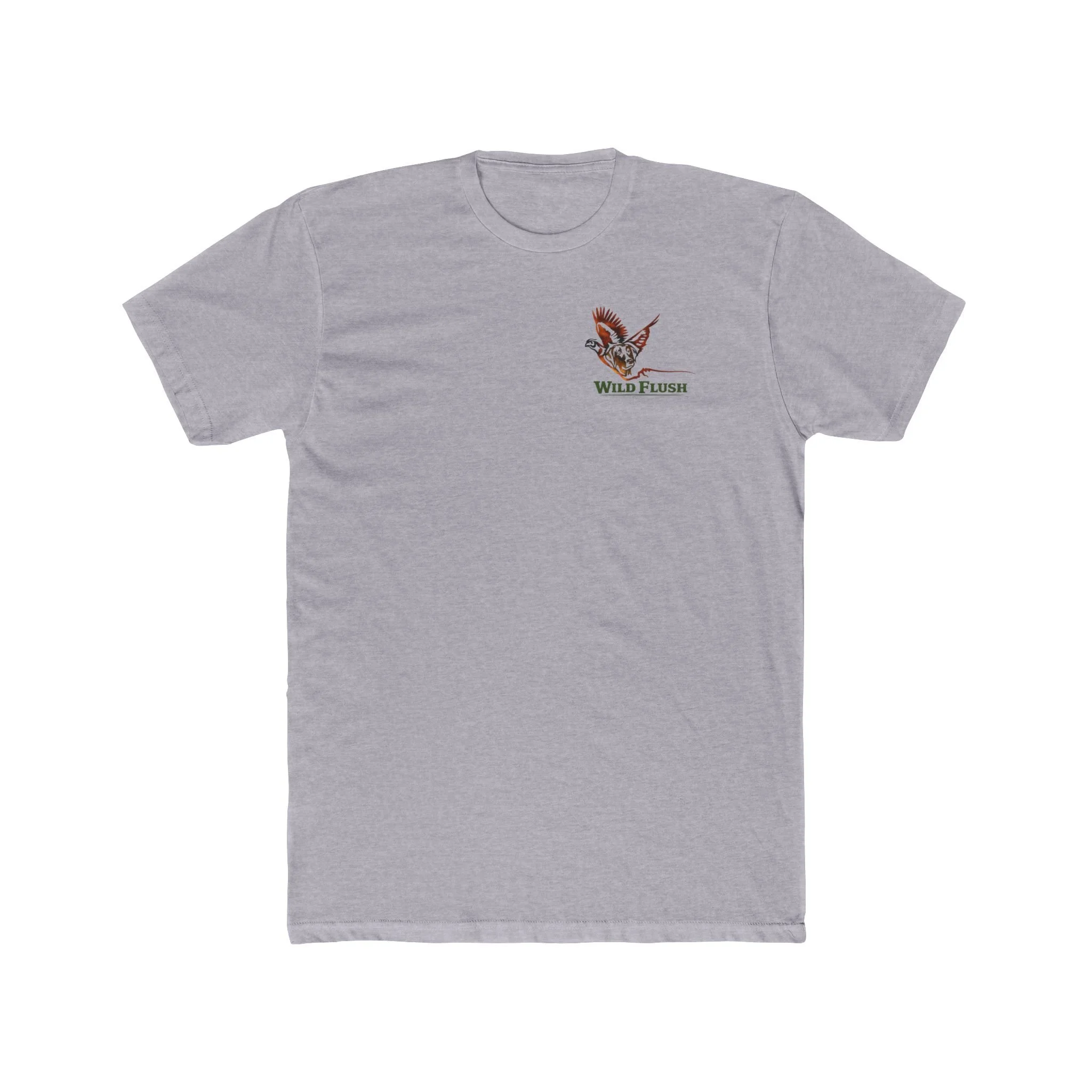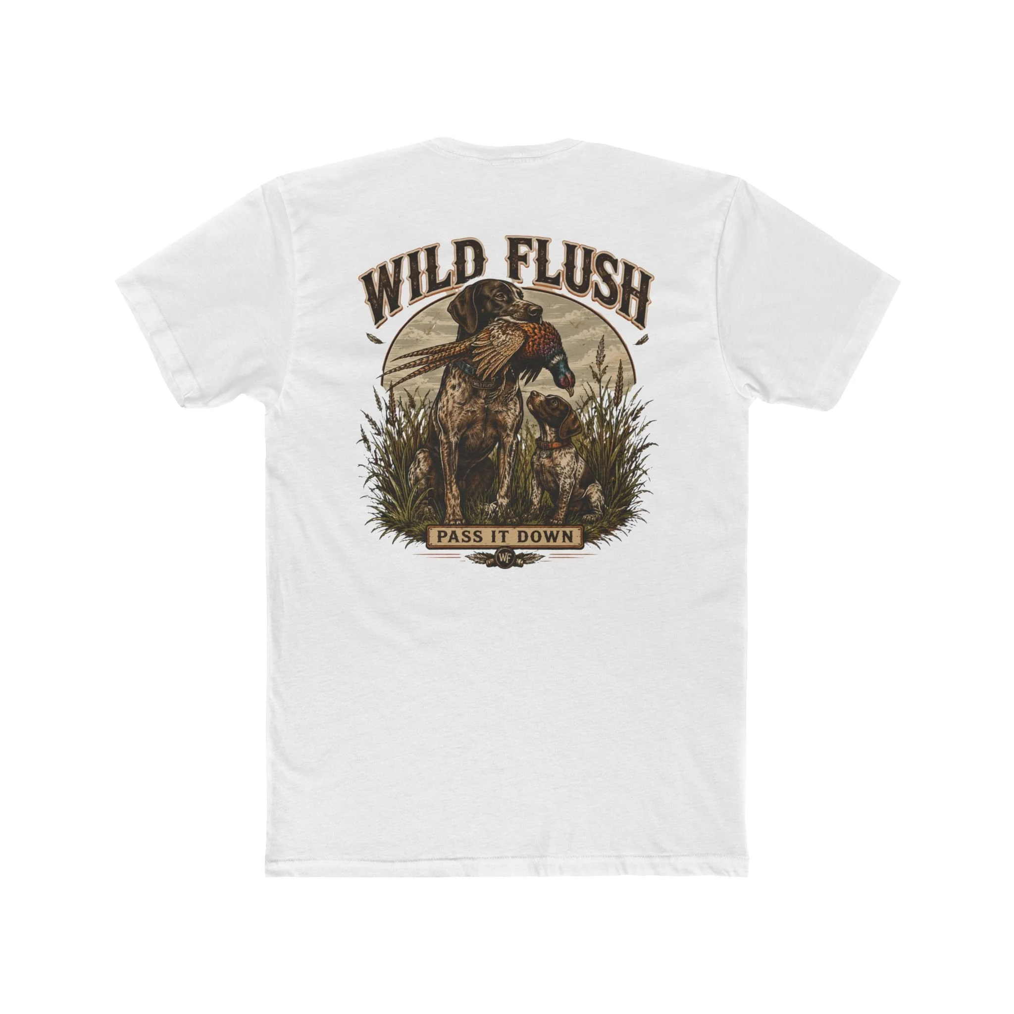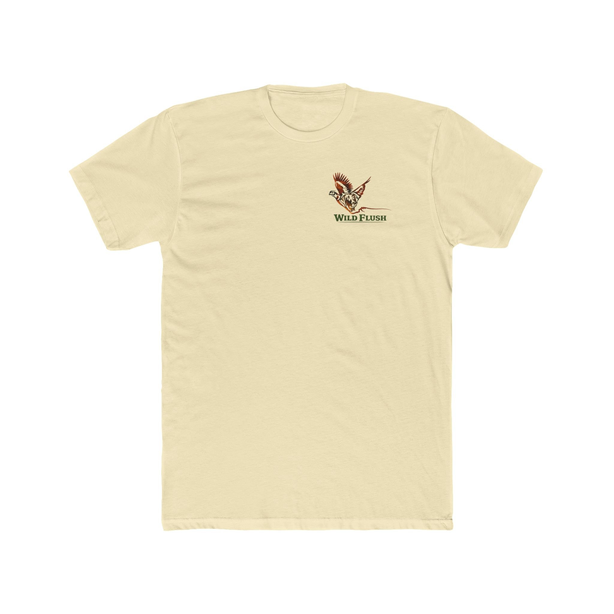 Lightweight and quietly confident, this crew tee carries a vintage outdoors spirit without shouting for attention. A small, detailed duck emblem rests over the heart; a larger, weathered scene on the back shows a flush of waterfowl rising through marsh grasses beneath the words “WILD FLUSH.” It feels like the hush before dawn on a hunting marsh — field-worn, practical, and full of the kind of stories you trade over coffee. Wear it on cool mornings, at lodge gatherings, or while scouting the blind. The subtle front mark keeps things low-key for everyday wear, while the graphic back shares where your loyalties lie.