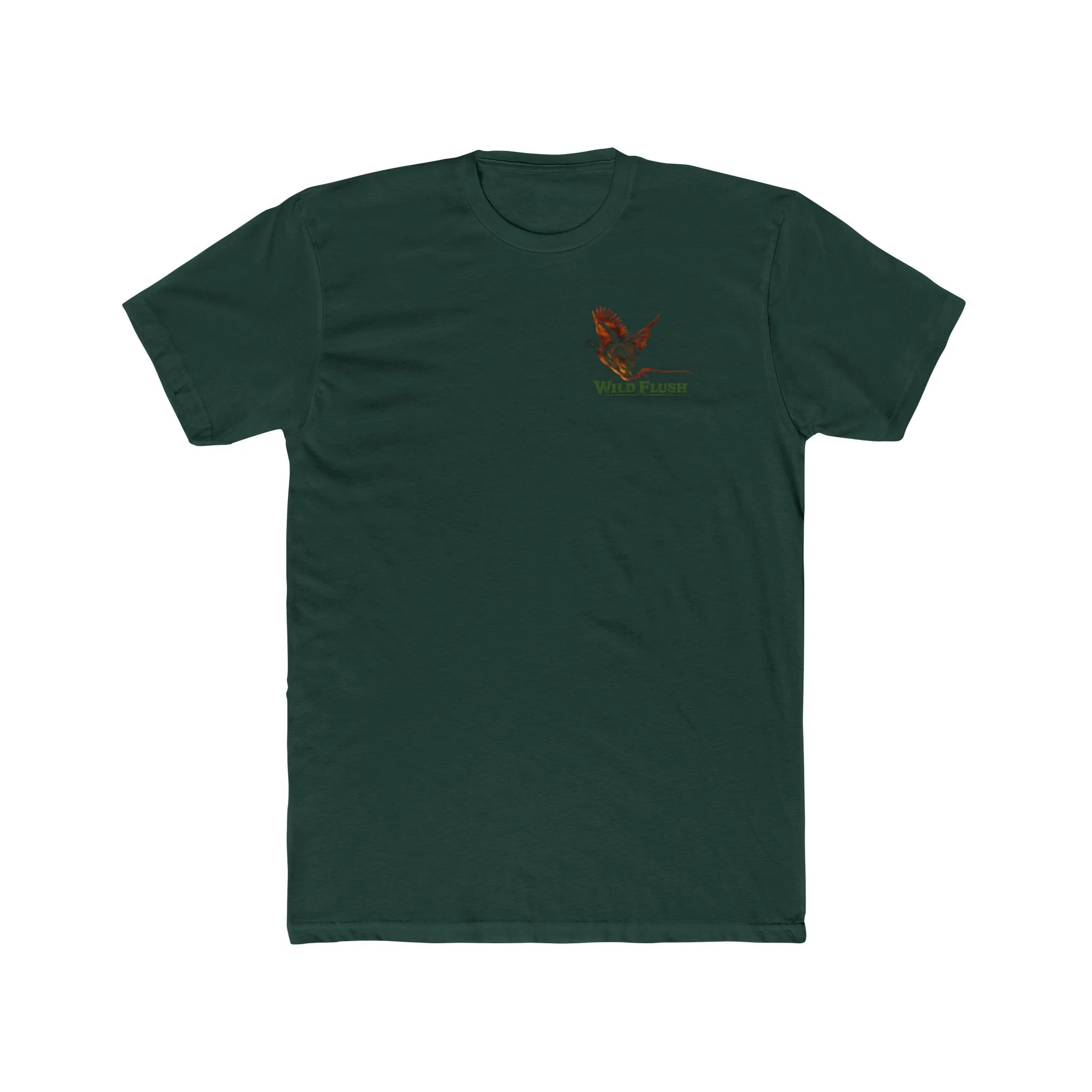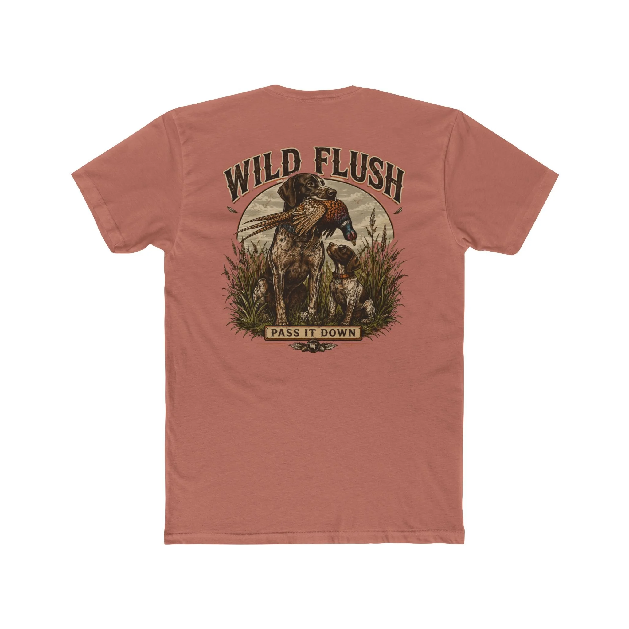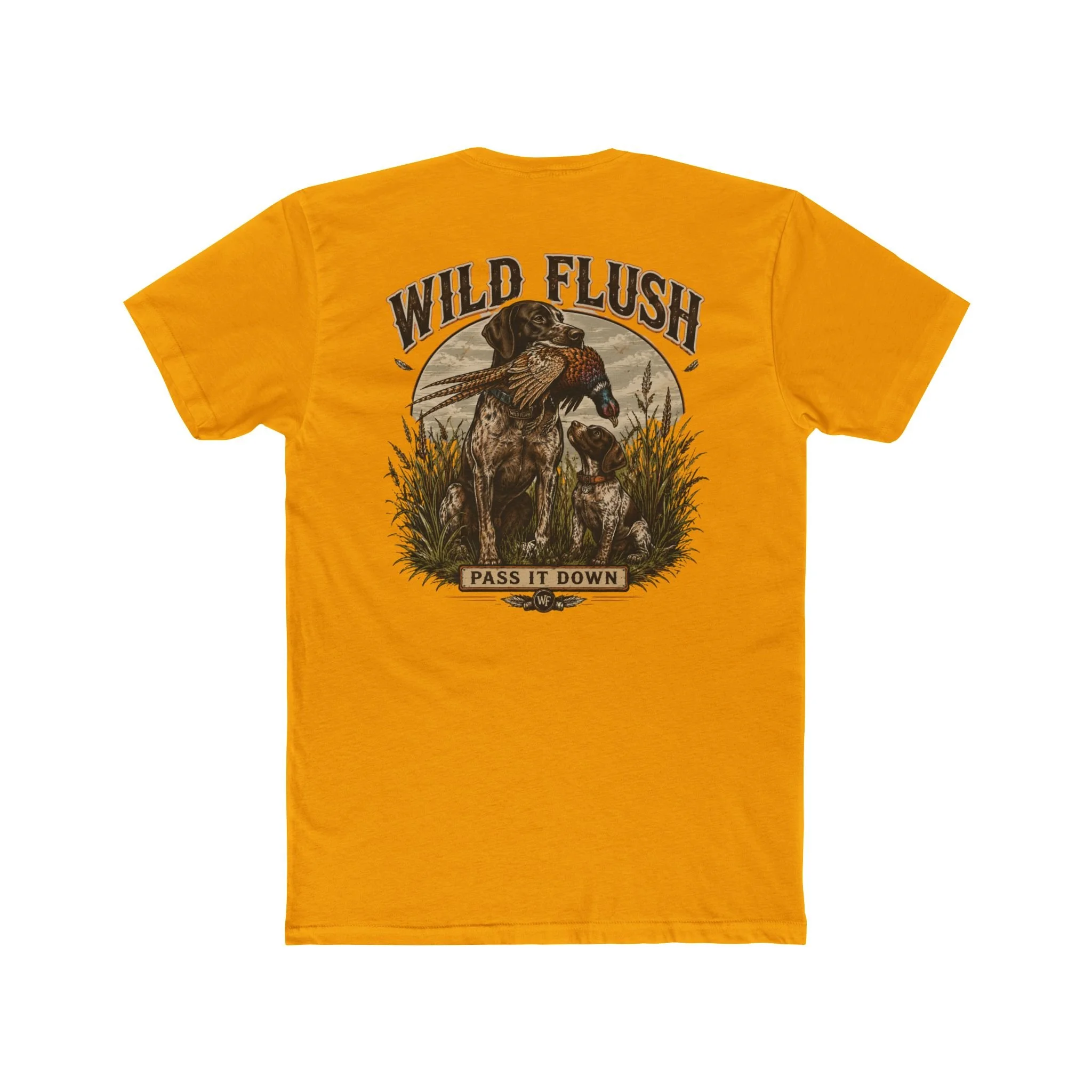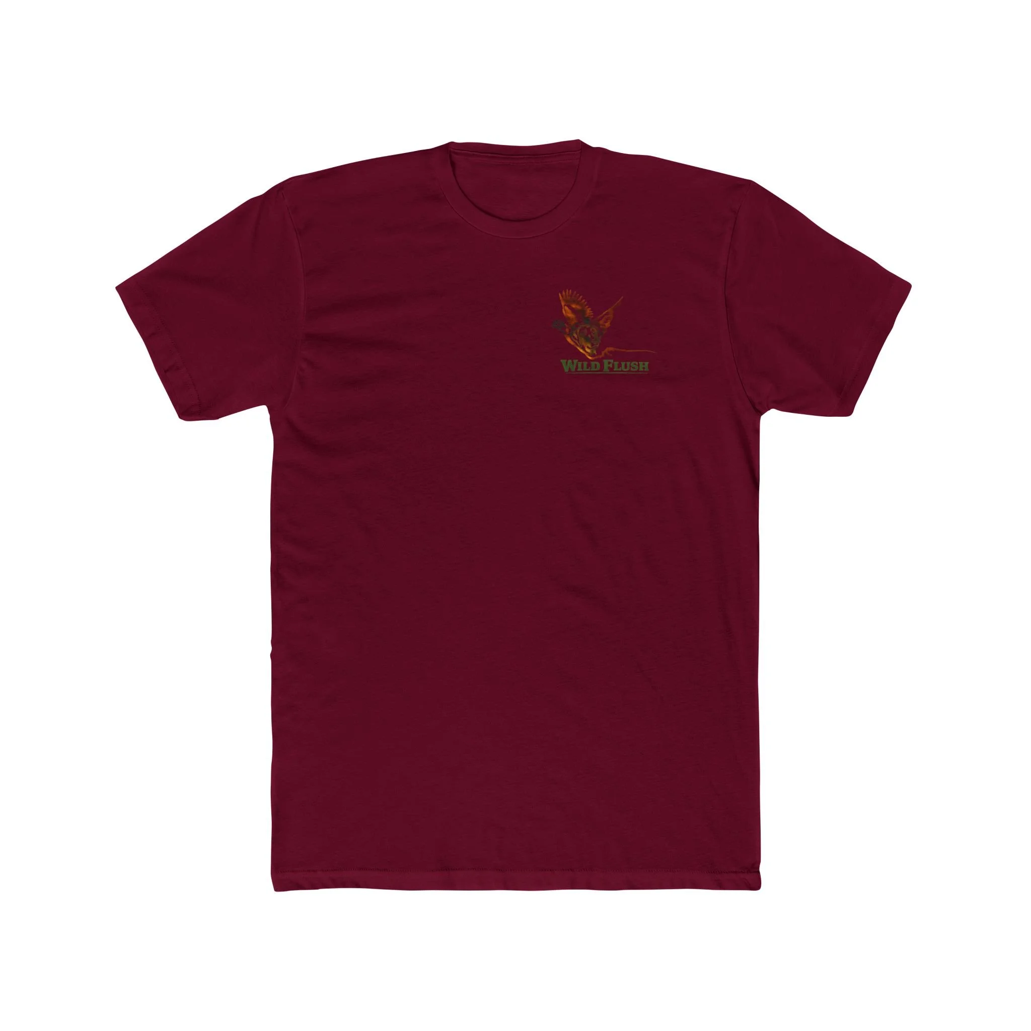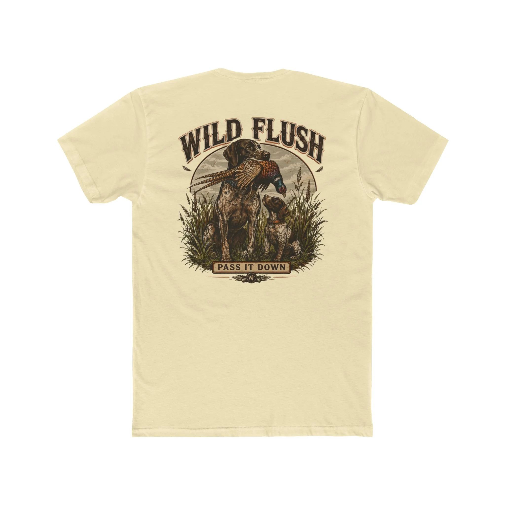 Lightweight and quietly confident, this crew tee carries a vintage outdoors spirit without shouting for attention. A small, detailed duck emblem rests over the heart; a larger, weathered scene on the back shows a flush of waterfowl rising through marsh grasses beneath the words “WILD FLUSH.” It feels like the hush before dawn on a hunting marsh — field-worn, practical, and full of the kind of stories you trade over coffee. Wear it on cool mornings, at lodge gatherings, or while scouting the blind. The subtle front mark keeps things low-key for everyday wear, while the graphic back shares where your loyalties lie.