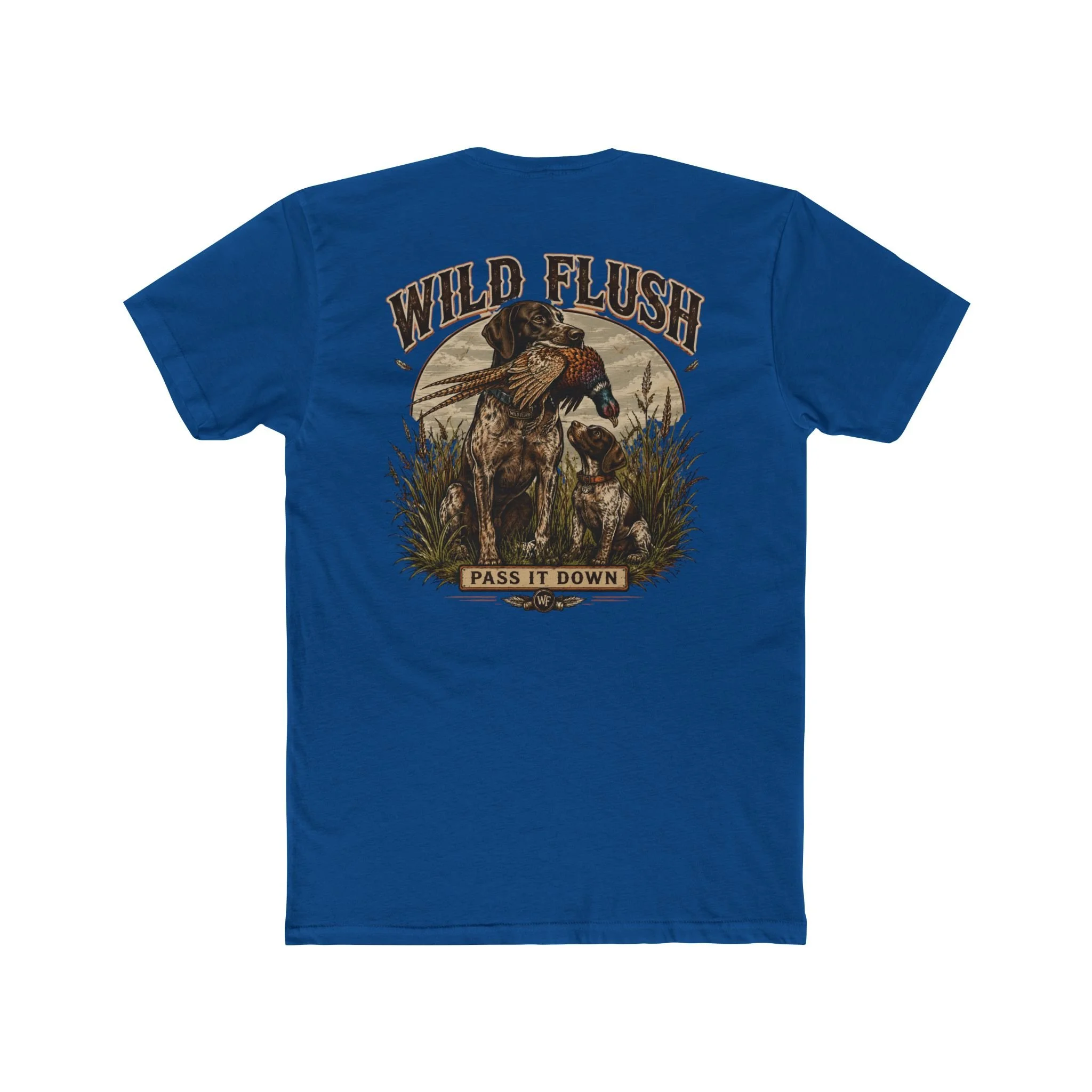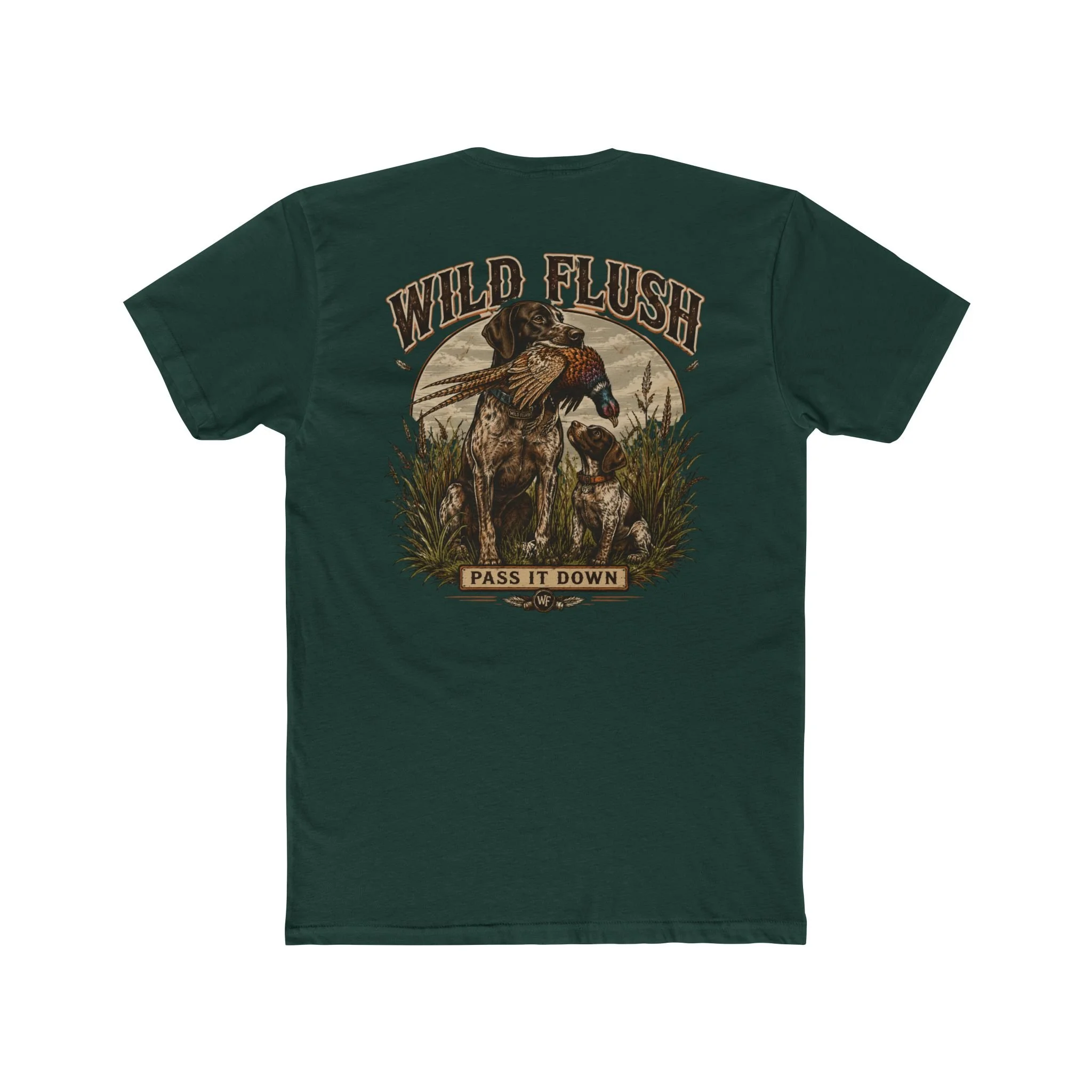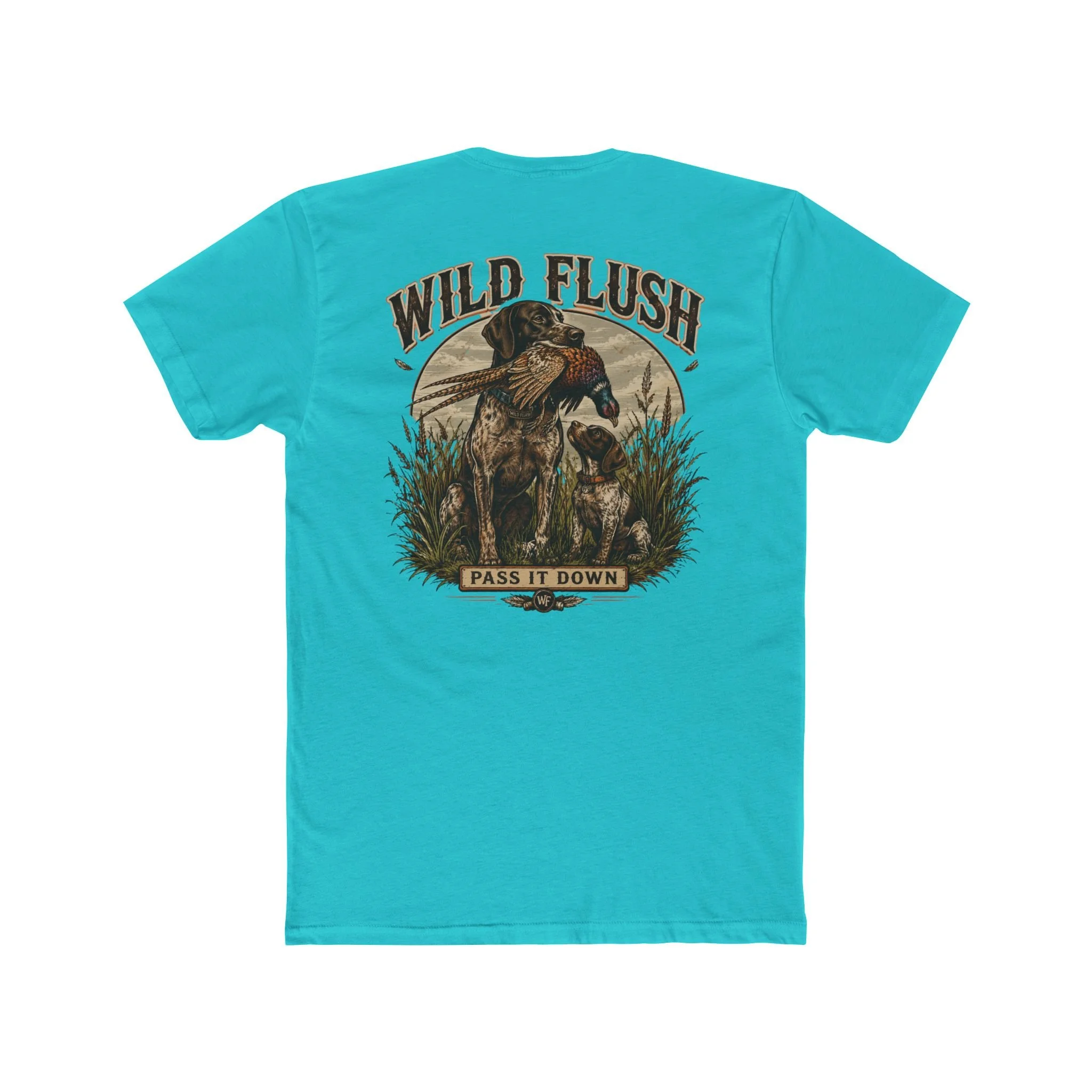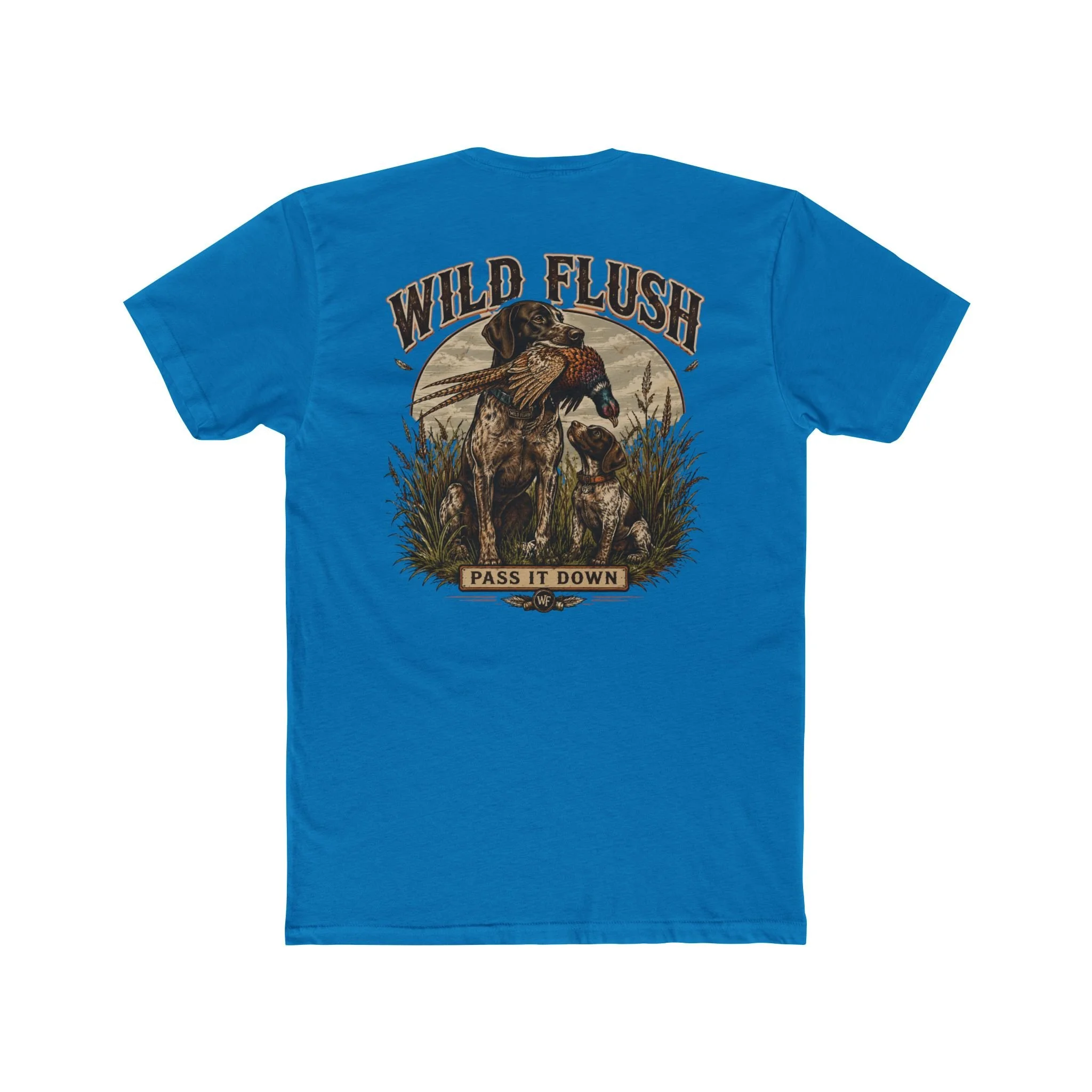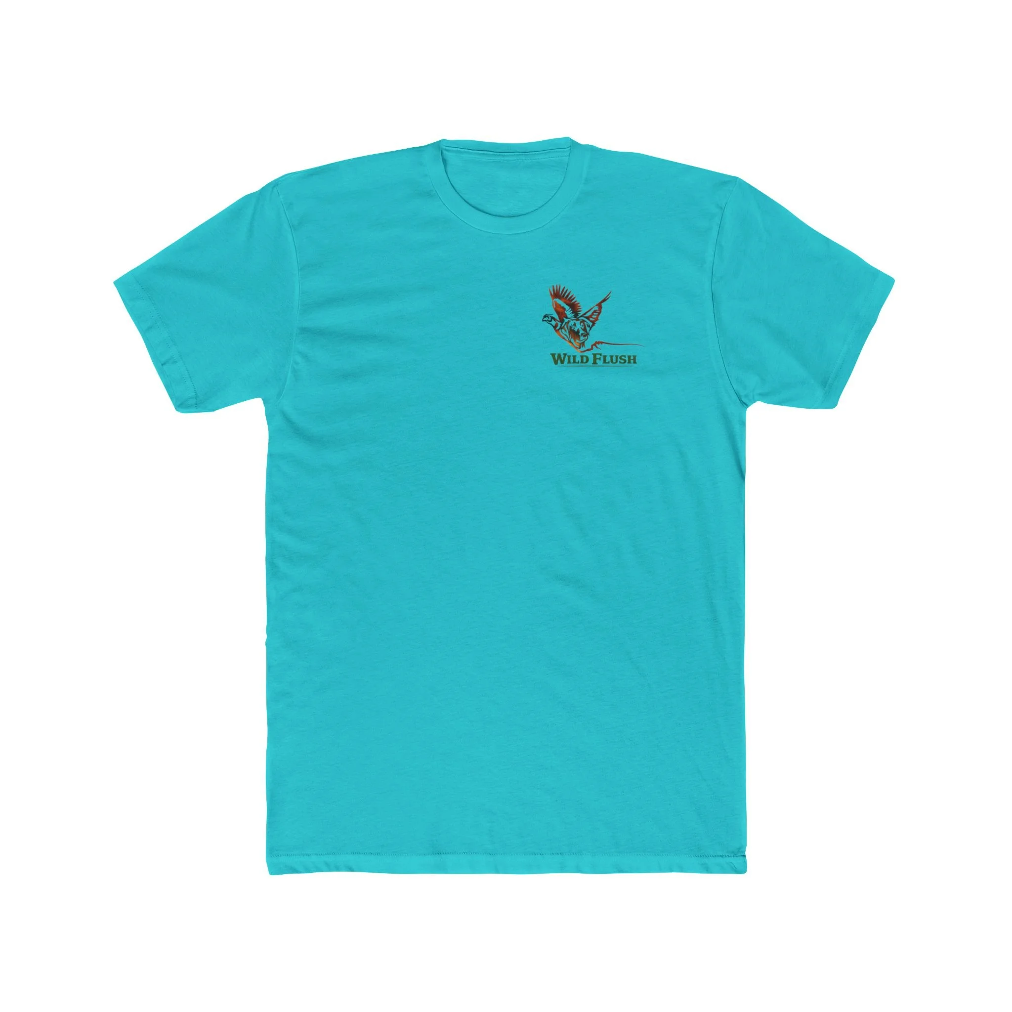 Lightweight and quietly confident, this crew tee carries a vintage outdoors spirit without shouting for attention. A small, detailed duck emblem rests over the heart; a larger, weathered scene on the back shows a flush of waterfowl rising through marsh grasses beneath the words “WILD FLUSH.” It feels like the hush before dawn on a hunting marsh — field-worn, practical, and full of the kind of stories you trade over coffee. Wear it on cool mornings, at lodge gatherings, or while scouting the blind. The subtle front mark keeps things low-key for everyday wear, while the graphic back shares where your loyalties lie.